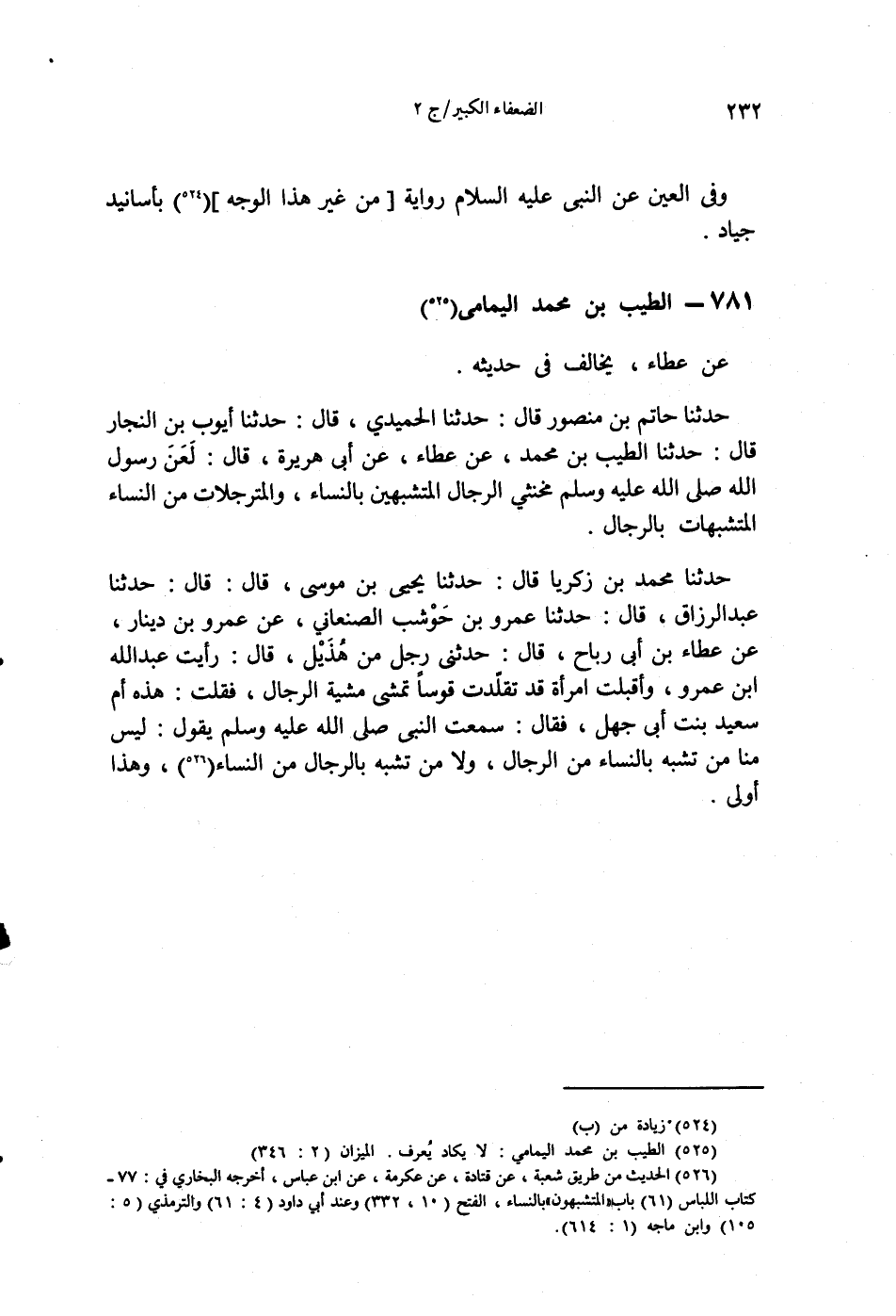 حَدَّثَنَا حَاتِمُ بْنُ مَنْصُورٍ قَالَ: حَدَّثَنَا الْحُمَيْدِيُّ قَالَ: حَدَّثَنَا أَيُّوبُ بْنُ النَّجَّارِ قَالَ: حَدَّثَنَا الطَّيِّبُ بْنُ مُحَمَّدٍ، عَنْ عَطَاءٍ، عَنْ أَبِي هُرَيْرَةَ قَالَ: لَعَنَ رَسُولُ اللَّهِ صَلَّى اللهُ عَلَيْهِ وَسَلَّمَ §مُخَنَّثِي الرِّجَالِ الْمُتَشَبِّهِينَ بِالنِّسَاءِ، وَالْمُتَرَجِّلَاتِ مِنَ النِّسَاءِ الْمُتَشَبِّهَاتِ بِالرِّجَالِ "