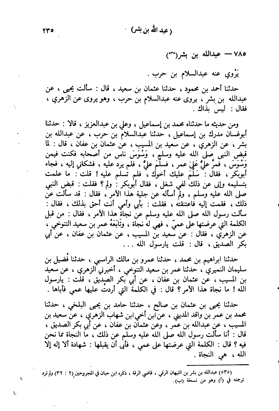 §786 - عَبْدُ اللَّهِ بْنُ بِشْرٍ يَرْوِي عَنْهُ عَبْدُ السَّلَامِ بْنُ حَرْبٍ. حَدَّثَنَا أَحْمَدُ بْنُ مَحْمُودٍ، حَدَّثَنَا عُثْمَانُ بْنُ سَعِيدٍ قَالَ: سَأَلْتُ يَحْيَى، عَنْ عَبْدِ اللَّهِ بْنِ بِشْرٍ، يَرْوِي عَنْهُ عَبْدُ السَّلَامِ بْنُ حَرْبٍ، وَهُوَ يَرْوِي عَنِ الزُّهْرِيِّ؟ فَقَالَ: لَيْسَ بِذَاكَ