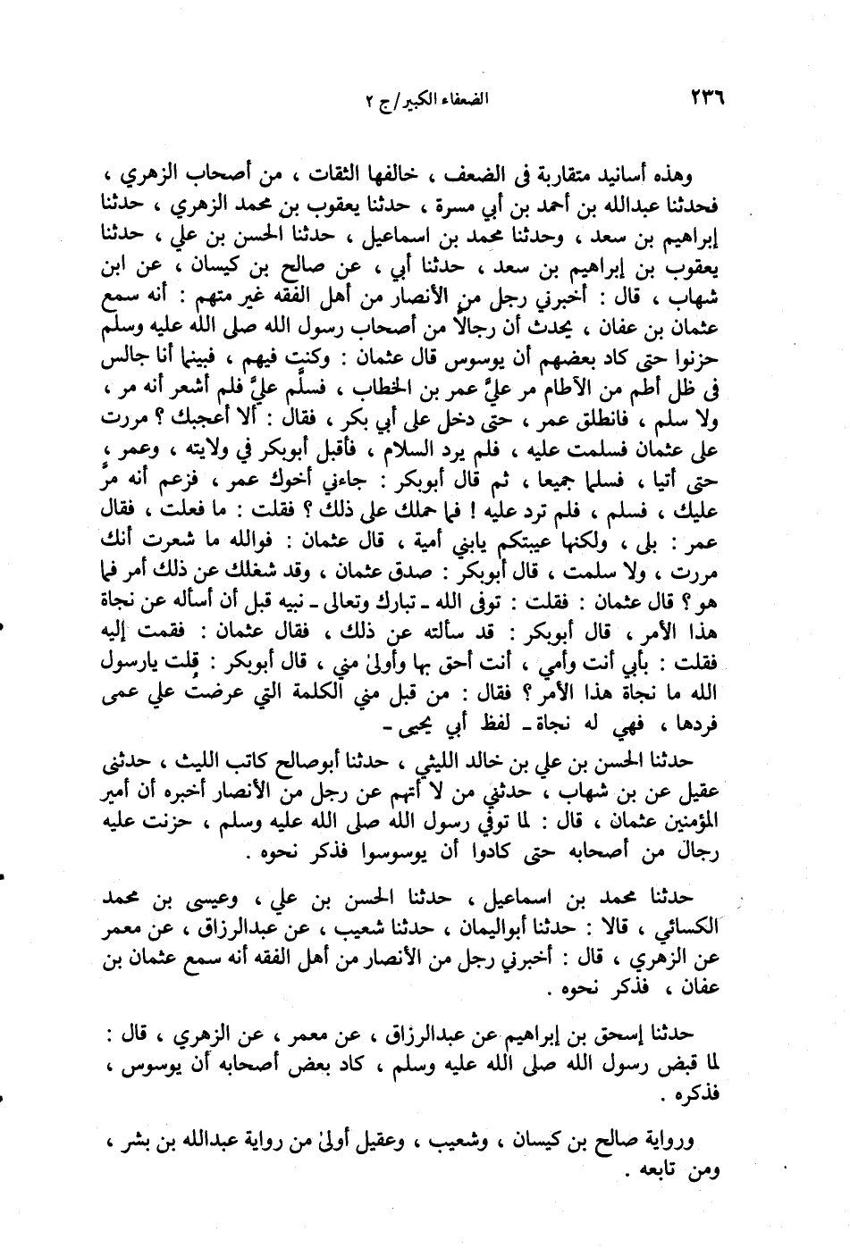 فَحَدَّثَنَا عَبْدُ اللَّهِ بْنُ أَحْمَدَ بْنِ أَبِي مَسَرَّةَ حَدَّثَنَا يَعْقُوبُ بْنُ مُحَمَّدٍ الزُّهْرِيُّ، حَدَّثَنَا إِبْرَاهِيمُ بْنُ سَعْدٍ، وَحَدَّثَنَا مُحَمَّدُ بْنُ إِسْمَاعِيلَ، حَدَّثَنَا الْحَسَنُ بْنُ عَلِيٍّ، حَدَّثَنَا يَعْقُوبُ بْنُ إِبْرَاهِيمَ بْنِ سَعْدٍ، حَدَّثَنَا أَبِي، عَنْ صَالِحِ بْنِ كَيْسَانَ، عَنِ ابْنِ شِهَابٍ قَالَ: أَخْبَرَنِي رَجُلٌ مِنَ الْأَنْصَارِ مِنْ أَهْلِ الْفِقْهِ غَيْرُ مُتَّهَمٍ، أَنَّهُ سَمِعَ عُثْمَانَ بْنَ عَفَّانَ يُحَدِّثُ: أَنَّ رِجَالًا مِنْ أَصْحَابِ رَسُولِ اللَّهِ صَلَّى اللهُ عَلَيْهِ وَسَلَّمَ حَزِنُوا حَتَّى كَادَ بَعْضُهُمْ أَنْ يُوَسْوَسَ، قَالَ عُثْمَانُ: وَكُنْتُ فِيهِمْ، فَبَيْنَمَا أَنَا جَالِسٌ فِي ظِلِّ أُطُمٍ مِنَ الْآطَامِ مَرَّ عَلَيَّ عُمَرُ بْنُ الْخَطَّابِ فَسَلَّمَ عَلَيَّ فَلَمْ أَشْعُرْ أَنَّهُ مَرَّ وَلَا سَلَّمَ، فَانْطَلَقَ عُمَرُ حَتَّى دَخَلَ عَلَى أَبِي بَكْرٍ فَقَالَ: أَلَا أُعْجِبُكَ؟ مَرَرْتُ عَلَى عُثْمَانَ فَسَلَّمْتُ عَلَيْهِ فَلَمْ يَرُدَّ السَّلَامَ، فَأَقْبَلَ أَبُو بَكْرٍ فِي وِلَايَتِهِ وَعُمَرُ حَتَّى أَتَيَا فَسَلَّمَا جَمِيعًا، ثُمَّ قَالَ أَبُو بَكْرٍ: جَاءَنِي أَخُوكَ عُمَرُ فَزَعَمَ أَنَّهُ مَرَّ عَلَيْكَ فَسَلَّمَ فَلَمْ تَرُدَّ عَلَيْهِ، فَمَا حَمَلَكَ عَلَى ذَلِكَ؟ فَقُلْتُ: مَا فَعَلْتُ، فَقَالَ عُمَرُ: بَلَى، وَلَكِنَّهَا عَيْبَتُكُمْ يَا بَنِي أُمَيَّةَ، قَالَ عُثْمَانُ: فَوَاللَّهِ مَا شَعَرْتُ أَنَّكَ مَرَرْتَ وَلَا سَلَّمْتَ، قَالَ أَبُو بَكْرٍ: صَدَقَ عُثْمَانُ، وَقَدْ شَغَلَكَ عَنْ ذَلِكَ أَمْرٌ، فَمَا هُوَ؟ قَالَ عُثْمَانُ: فَقُلْتُ: تَوَفَّى اللَّهُ تَبَارَكَ وَتَعَالَى نَبِيَّهُ قَبْلَ أَنْ أَسْأَلَهُ عَنْ نَجَاةِ هَذَا الْأَمْرِ، قَالَ أَبُو بَكْرٍ: قَدْ سَأَلْتُهُ عَنْ ذَلِكَ، فَقَالَ عُثْمَانُ: فَقُمْتُ إِلَيْهِ فَقُلْتُ: بِأَبِي أَنْتَ وَأُمِّي، أَنْتَ أَحَقُّ بِهَا وَأَوْلَى مِنِّي، قَالَ أَبُو بَكْرٍ: قُلْتُ: يَا رَسُولَ اللَّهِ، مَا نَجَاةُ هَذَا الْأَمْرِ؟ فَقَالَ: §«مَنْ قَبِلَ مِنِّي الْكَلِمَةَ الَّتِي عَرَضْتُ عَلَى عَمِّي فَرَدَّهَا فَهِيَ لَهُ نَجَاةٌ» لَفْظُ أَبِي يَحْيَى حَدَّثَنَا الْحَسَنُ بْنُ عَلِيِّ بْنِ خَالِدٍ اللَّيْثِيُّ، حَدَّثَنَا أَبُو صَالِحٍ كَاتِبُ اللَّيْثِ، حَدَّثَنِي عُقَيْلٌ، عَنِ ابْنِ شِهَابٍ، حَدَّثَنِي مَنْ، لَا أَتَّهِمُ، عَنْ رَجُلٍ، مِنَ الْأَنْصَارِ، أَخْبَرَهُ أَنَّ أَمِيرَ الْمُؤْمِنِينَ عُثْمَانَ قَالَ: لَمَّا تُوُفِّيَ رَسُولُ اللَّهِ صَلَّى اللهُ عَلَيْهِ وَسَلَّمَ حَزِنَتْ عَلَيْهِ رِجَالٌ مِنْ أَصْحَابِهِ حَتَّى كَادُوا أَنَّ يُوَسْوَسُوا، فَذَكَرَ نَحْوَهُ حَدَّثَنَا مُحَمَّدُ بْنُ إِسْمَاعِيلَ قَالَ: حَدَّثَنَا الْحَسَنُ بْنُ عَلِيٍّ، وَعِيسَى بْنُ مُحَمَّدٍ الْكِسَائِيُّ، قَالَا: حَدَّثَنَا أَبُو الْيَمَانِ، حَدَّثَنَا شُعَيْبٌ، عَنْ عَبْدِ الرَّزَّاقِ، عَنْ مَعْمَرٍ، عَنِ الزُّهْرِيِّ قَالَ: أَخْبَرَنِي رَجُلٌ مِنَ الْأَنْصَارِ مِنْ أَهْلِ الْفِقْهِ أَنَّهُ سَمِعَ عُثْمَانَ بْنَ عَفَّانَ فَذَكَرَ نَحْوَهُ حَدَّثَنَا إِسْحَاقُ بْنُ إِبْرَاهِيمَ، عَنْ عَبْدِ الرَّزَّاقِ، عَنْ مَعْمَرٍ، عَنِ الزُّهْرِيِّ قَالَ: لَمَّا قُبِضَ رَسُولُ اللَّهِ صَلَّى اللهُ عَلَيْهِ وَسَلَّمَ كَادَ بَعْضُ أَصْحَابِهِ أَنْ يُوَسْوَسَ، فَذَكَرَهُ وَرِوَايَةُ صَالِحِ بْنِ كَيْسَانَ، وَشُعَيْبٍ، وَعُقَيْلٍ أَوْلَى مِنْ رِوَايَةِ عَبْدِ اللَّهِ بْنِ بِشْرٍ وَمَنْ تَابَعَهُ