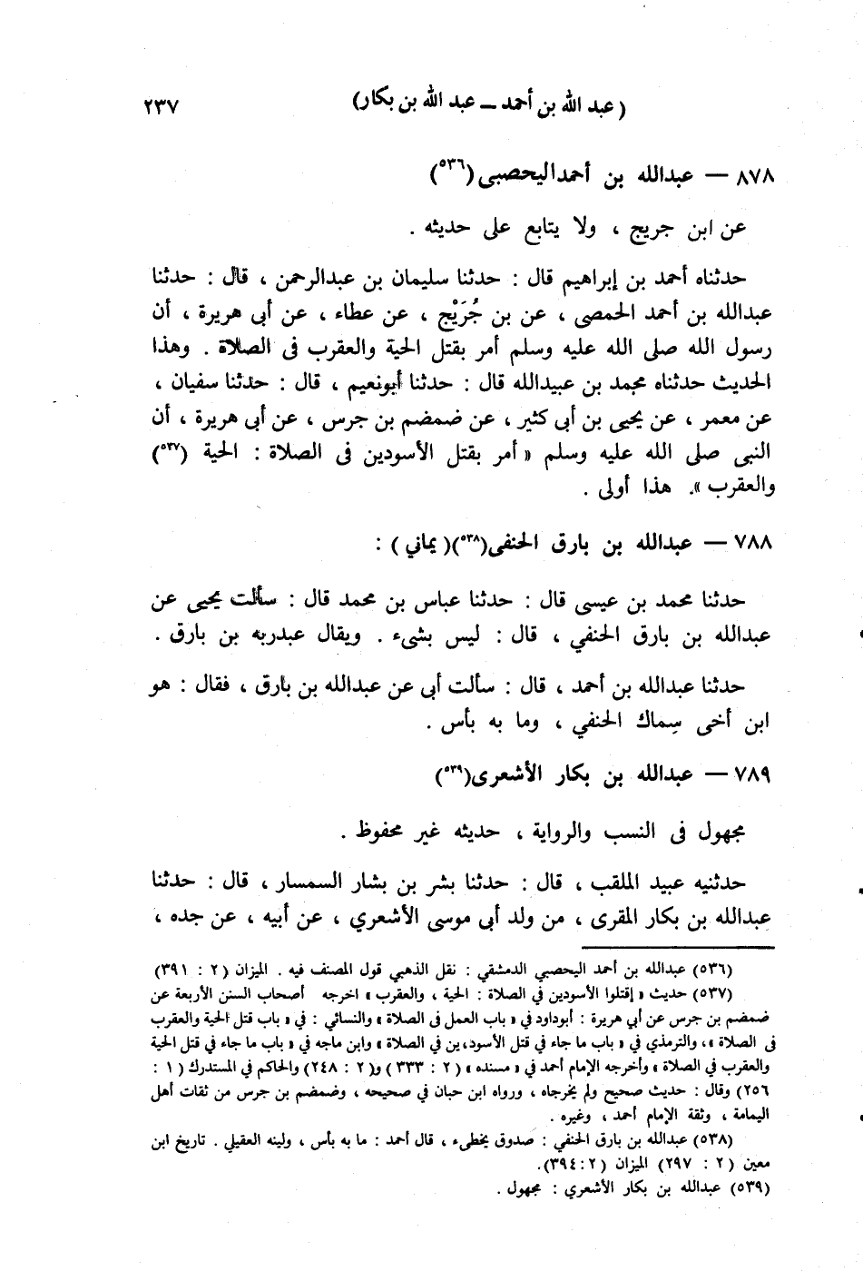 §788 - عَبْدُ اللَّهِ بْنُ بَارِقٍ الْحَنَفِيُّ يَمَانِيٌّ حَدَّثَنَا مُحَمَّدُ بْنُ عِيسَى قَالَ: حَدَّثَنَا عَبَّاسٌ قَالَ: سَأَلْتُ يَحْيَى عَنْ عَبْدِ اللَّهِ بْنِ بَارِقٍ الْحَنَفِيِّ فَقَالَ: لَيْسَ بِشَيْءٍ وَيُقَالُ: عَبْدُ رَبِّهِ بْنُ بَارِقٍ. حَدَّثَنَا عَبْدُ اللَّهِ بْنُ أَحْمَدَ قَالَ: سَأَلْتُ أَبِي عَنْ عَبْدِ اللَّهِ بْنِ بَارِقٍ، فَقَالَ: هُوَ ابْنُ أَخِي سِمَاكٍ الْحَنَفِيِّ، وَمَا بِهِ بَأْسٌ
