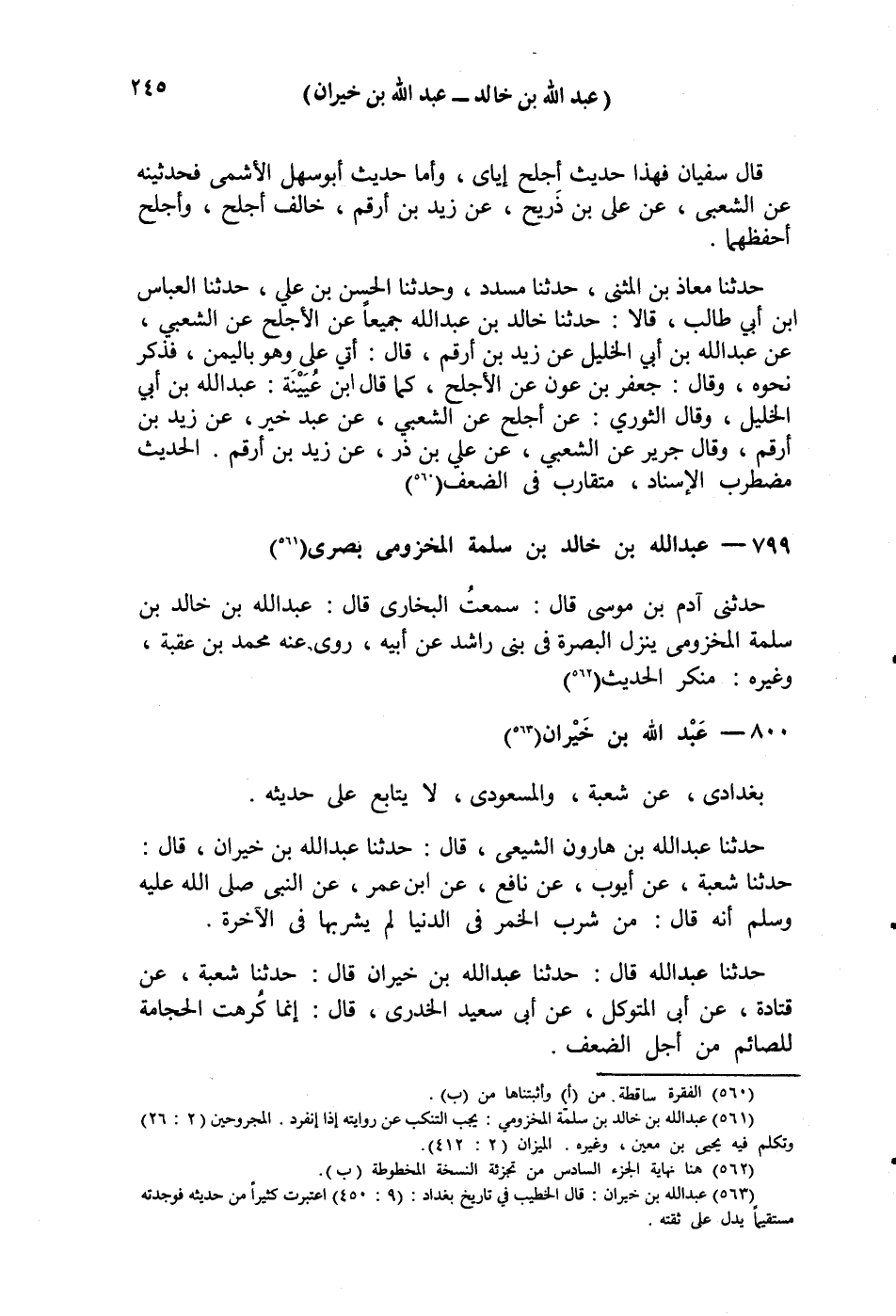 §799 - عَبْدُ اللَّهِ بْنُ خَالِدِ بْنِ سَلَمَةَ الْمَخْزُومِيُّ بَصْرِيٌّ حَدَّثَنِي آدَمُ بْنُ مُوسَى قَالَ: سَمِعْتُ الْبُخَارِيَّ قَالَ: عَبْدُ اللَّهِ بْنُ خَالِدِ بْنِ سَلَمَةَ الْمَخْزُومِيُّ يَنْزِلُ الْبَصْرَةَ فِي بَنِي رَاشِدٍ عَنْ أَبِيهِ، رَوَى عَنْهُ مُحَمَّدُ بْنُ عُقْبَةَ وَغَيْرُهُ، مُنْكَرُ الْحَدِيثِ