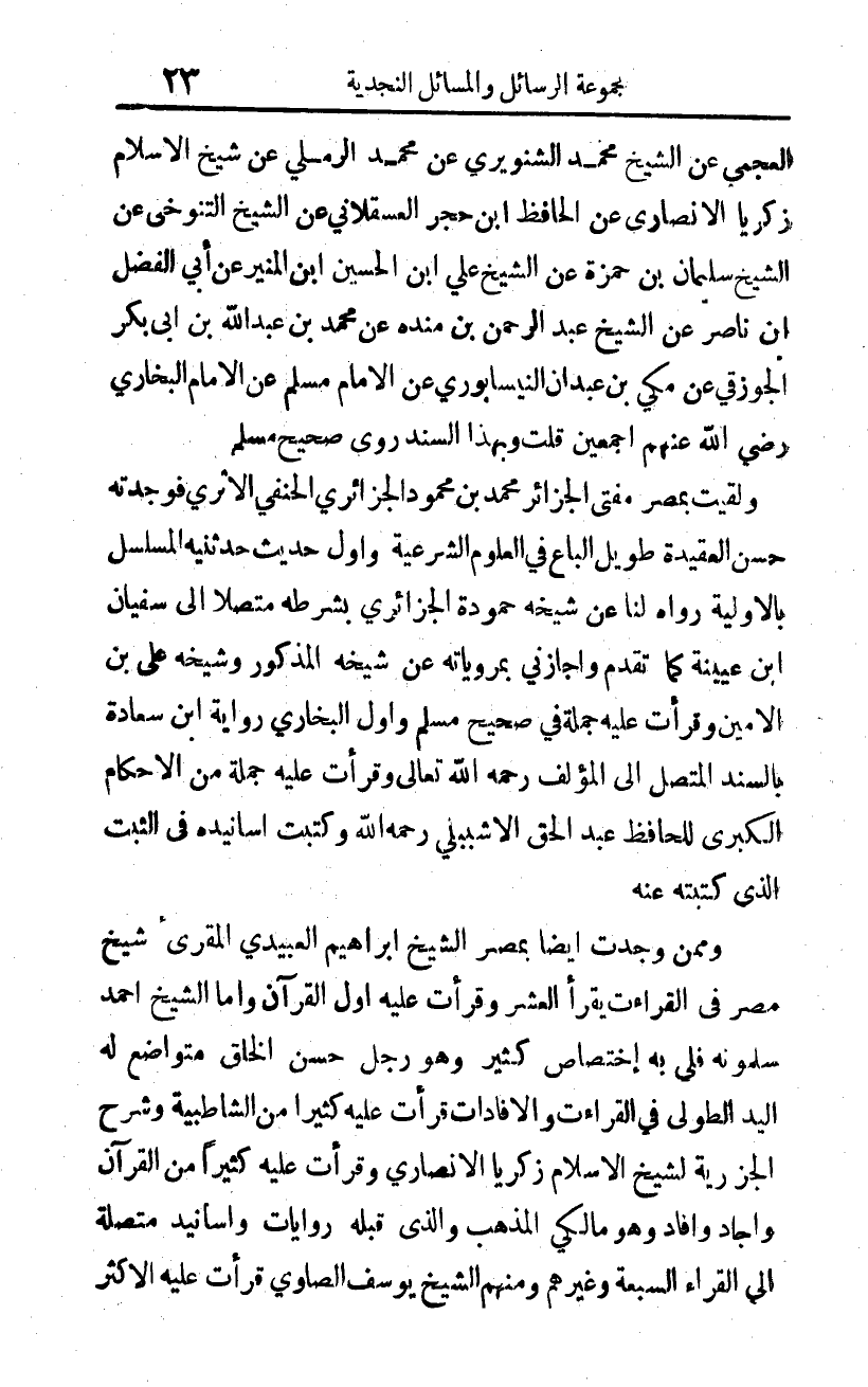 العجمي عن الشيخ محمد الشنويري عن محمد الرملي عن شيخ الإسلام زكريا الأنصاري عن الحافظ ابن حجر العسقلاني عن الشيخ التنوخي عن الشيخ سليمان بن حمزة عن الشيخ علي بن الحسين بن المنير عن أبي الفضل بن ناصر عن الشيخ عبد الرحمن بن منده عن محمد بن عبد الله بن أبي بكر الجوزقي عن مكي بن عبدان النيسابوري عن الإمام مسلم عن الإمام البخاري -رضي الله عنهم أجمعين قلت: وبهذا السند روي صحيح مسلم.