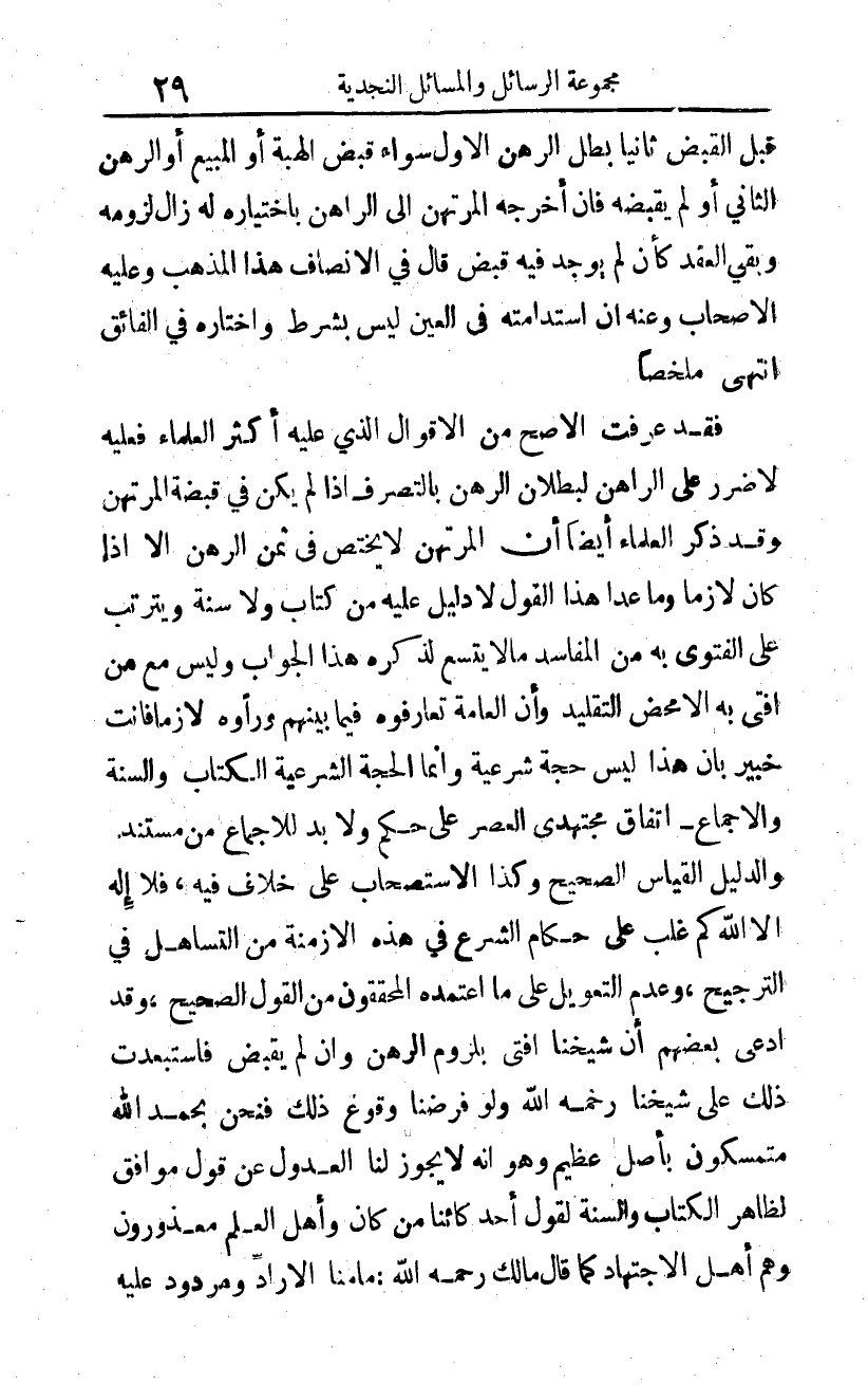 فقد عرفت الأصح من الأقوال الذي عليه أكثر العلماء، فعليه لا ضرر على الراهن لبطلان الرهن بالتصرف إذا لم يكن في قبضة المرتهن. وقد ذكر العلماء -أيضا- أن المرتهن لا يختص في ثمن الرهن إلا إذا كان لازما، وما عدا هذا القول لا دليل عليه من كتاب ولا سنة، ويترتب على الفتوى به من المفاسد ما لا يتسع لذكره هذا الجواب، وليس مع من أفتى به إلا محض التقليد، وأن العامة تعارفوه فيما بينهم ورأوه لازما فأنت خبير بأن هذا ليس حجة شرعية، وإنما الحجة الشرعية الكتاب والسنة والإجماع -اتفاق مجتهدي العصر على حكم- ولا بد للإجماع من مستند، والدليل القياس الصحيح وكذا الاستصحاب على خلاف فيه. فلا إله إلا الله كم غلب على حكام الشرع في هذه الأزمنة من التساهل في الترجيح، وعدم التعويل على ما اعتمده المحققون من القول الصحيح. وقد ادعى بعضهم أن شيخنا أفتى بلزوم الرهن وإن لم يقبض، فاستبعدت ذلك على شيخنا -رحمه الله-؛ ولو فرضنا وقوع ذلك، فنحن بحمد الله متمسكون بأصل عظيم، وهو أنه لا يجوز لنا العدول عن قول موافق لظاهر الكتاب والسنة لقول أحد كائنا من كان. وأهل العلم معذورون وهم أهل الاجتهاد كما قال مالك -رحمه الله-: ما منا إلا راد ومردود عليه