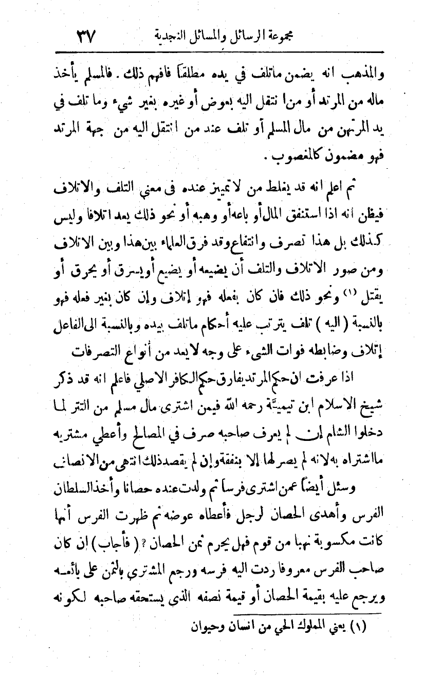 والمذهب أنه يضمن ما تلف في يده مطلقا، فافهم ذلك. المرتد لا يملك مال المسلم مطلقا، فافهم ذلك.