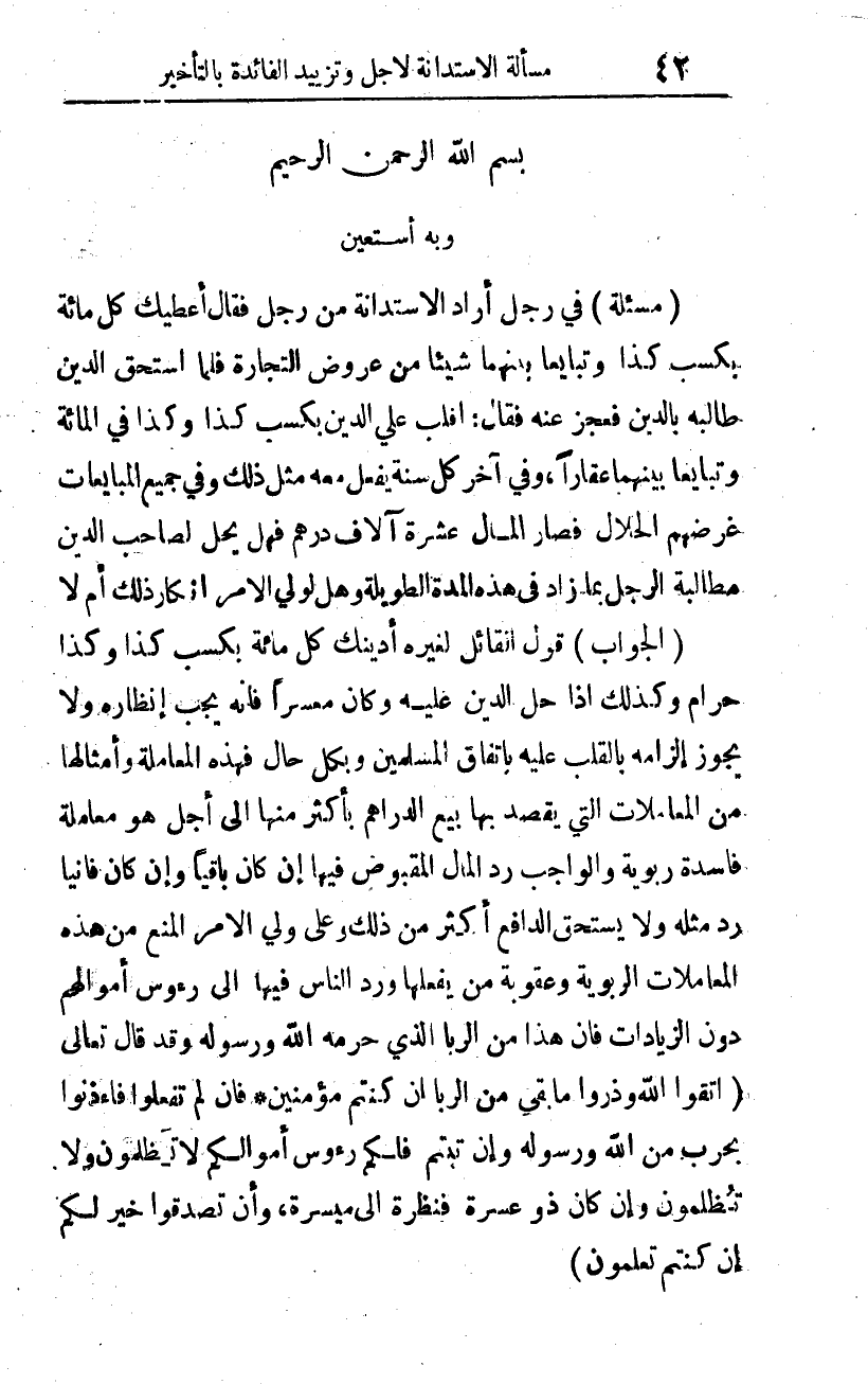 (فالجواب): قول القائل لغيره: أدينك كل مائة بكسب كذا وكذا حرام. وكذلك إذا حل الدين عليه وكان معسرا، فإنه يجب إنظاره؛ ولا يجوز إلزامه بالقلب عليه باتفاق المسلمين. وبكل حال فهذه المعاملة وأمثالها من المعاملات التي يقصد بها بيع الدراهم بأكثر منها إلى أجل هو معاملة فاسدة ربوية، والواجب رد المال المقبوض فيها، إن كان باقيا، وإن كان فانيا رد مثله؛ ولا يستحق الدافع أكثر من ذلك. وعلى ولي الأمر المنع من هذه المعاملات الربوية، وعقوبة من يفعلها، ورد الناس فيها إلى رؤوس أموالهم دون الزيادات؛ فإن هذا من الربا الذي حرَّمه الله ورسوله، وقد قال -تعالى-: {يَا أَيُّهَا الَّذِينَ آمَنُوا اتَّقُوا اللَّهَ وَذَرُوا مَا بَقِيَ مِنَ الرِّبا إِنْ كُنْتُمْ فَإِنْ لَمْ تَفْعَلُوا فَأْذَنُوا بِحَرْبٍ مِنَ اللَّهِ وَرَسُولِهِ وَإِنْ تُبْتُمْ فَلَكُمْ رُؤُوسُ أَمْوَالِكُمْ لا تَظْلِمُونَ وَلا تُظْلَمُونَ وَإِنْ كَانَ ذُو عُسْرَةٍ فَنَظِرَةٌ إِلَى مَيْسَرَةٍ وَأَنْ تَصَدَّقُوا خَيْرٌ لَكُمْ إِنْ كُنْتُمْ تَعْلَمُونَ} 1.