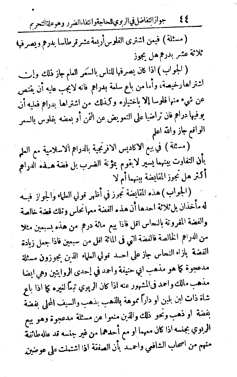 (مسألة) في بيع الأكاديس الإفرنجية بالدراهم الإسلامية مع العلم بأن التفاوت بينهما يسير لا يقوم بمؤنة الضرب، بل فضة هذه الدراهم أكثر، هل تجوز المقايضة بينهما أم لا؟
