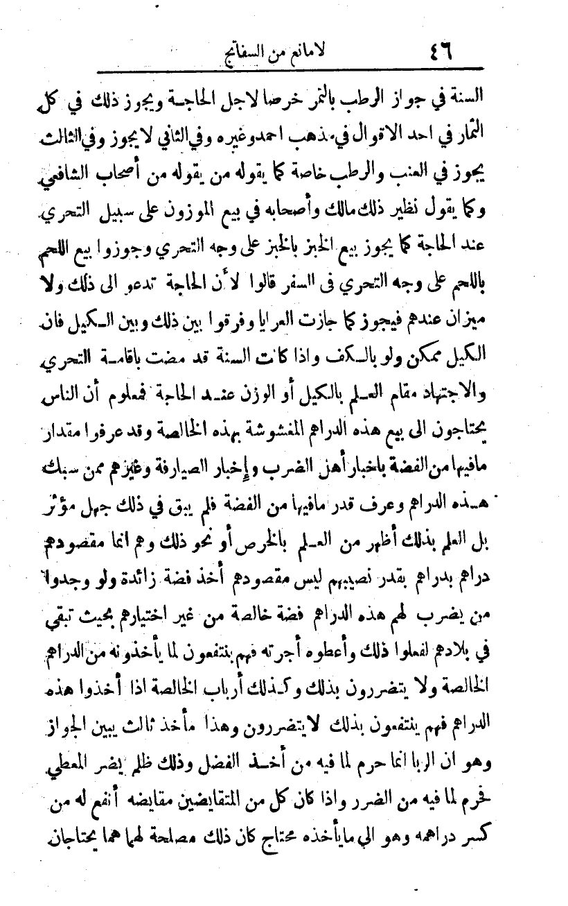 السنة في جواز الرطب بالتمر خرصا لأجل الحاجة. ويجوز ذلك في كل الثمار في أحد الأقوال في مذهب أحمد وغيره، وفي الثاني: لا يجوز، وفي الثالث: يجوز في العنب والرطب خاصة، كما يقوله من يقوله من أصحاب الشافعي، وكما يقول نظير ذلك مالك وأصحابه في بيع الموزون على سبيل التحري عند الحاجة، كما يجوز بيع الخبز بالخبز على وجه التحري. وجوَّزوا بيع اللحم باللحم على وجه التحري في السفر، قالوا: لأن الحاجة تدعو إلى ذلك ولا ميزان عندهم؛ فيجوز كما جازت العرايا؛ وفرَّقوا بين ذلك وبين الكيل، فإن الكيل ممكن ولو بالكف. وإذا كانت السنة قد مضت بإقامة التحري والاجتهاد مقام العلم بالكيل أو الوزن عند الحاجة، فمعلوم أن الناس يحتاجون إلى بيع هذه الدراهم المغشوشة بهذه الخالصة، وقد عرفوا مقدار ما فيها من الفضة بإخبار أهل الضرب وإخبار الصيارفة وغيرهم ممن سبك هذه الدراهم، وعرف قدر ما فيها من الفضة، فلم يبق في ذلك جهل مؤثر، بل العلم بذلك أظهر من العلم الخرص أو نحو ذلك.