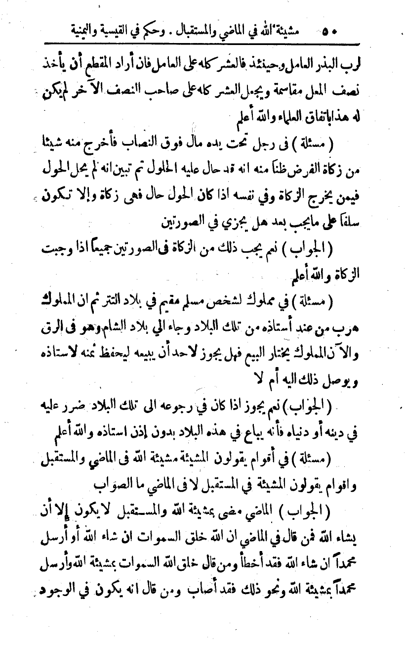 (مسألة) في أقوام يقولون: المشيئة، مشيئة الله في الماضي والمستقبل. وأقوام يقولون: المشيئة في المستقبل لا في الماضي، ما الصواب؟