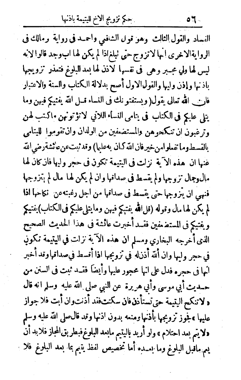 وأيضا فقد ثبت في السنن من حديث أبي موسى وأبي هريرة عن النبي صلى الله عليه وسلم أنه قال: "لا تنكح اليتيمة حتى تستأذن، فإن سكتت فقد أذنت، وإن أبت فلا جواز عليها"3 فجَوَّز تزويجها بإذنها، ومنعه بدون إذنها، وقد قال صلى الله عليه وسلم: "لا يُتْمَ بعد احتلامٍ"4 ولو أريد باليتيم ما بعد البلوغ فبطريق المجاز؛ فلا بد أن يعم ما قبل البلوغ وما بعده، أما تخصيص لفظ يتيم بما بعد البلوغ فلا