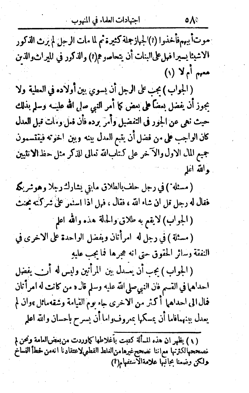 1 يظهر أن هذه المسألة كتبت بأغلاطها كما وردت من بعض العامة ونحن لم نصححها لكثرتها مع أننا نصحح غيرها من الغلط القطعي لاعتقادنا أنه من خطأ النساخ ولكن وضعنا بجانبها علامة الاستفهام (؟).