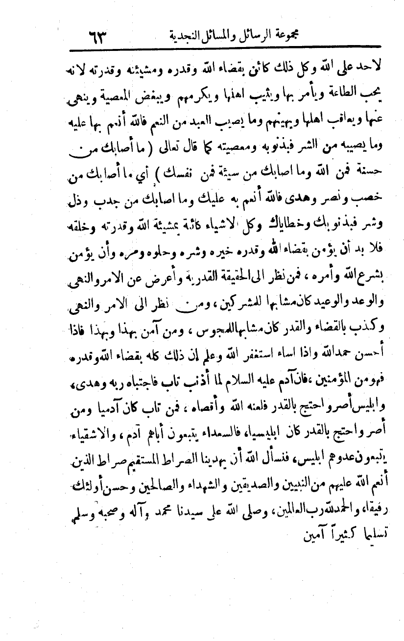 فإن آدم -عليه السلام- لما أذنب تاب فاجتباه ربه وهدى، وإبليس أصر واحتج بالقدر فلعنه الله وأقصاه. فمن تاب كان آدميا، ومن أصر واحتج بالقدر كان إبليسيا. فالسعداء يتبعون أباهم آدم، والأشقياء يتبعون عدوهم إبليس. فنسأل الله أن يهدينا الصراط المستقيم صراط الذين أنعم الله عليهم من النبيين والصديقين والشهداء والصالحين وحسن أولئك رفيقا، والحمد لله رب العالمين، وصلى الله على سيدنا محمد وآله وصحبه وسلم تسليما كثيرا آمين.
