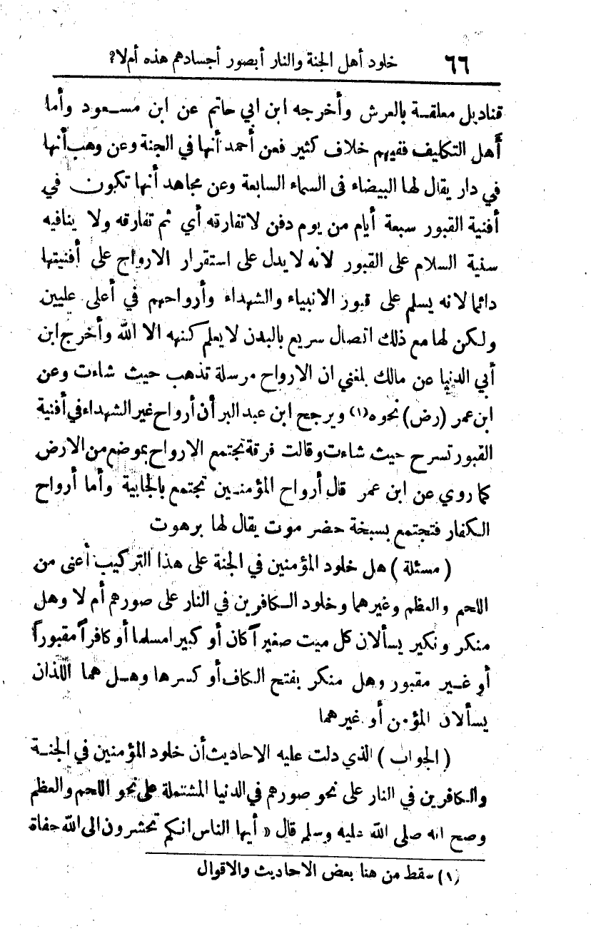 (مسألة): هل خلود المؤمنين في الجنة على هذا التركيب أعني من اللحم والعظم وغيرهما، وخلود الكافرين في النار على صورهم أم لا؟ وهل منكر ونكير يسألان كل ميت صغيرا كان أو كبيرا مسلما أو كافرا مقبورا أو غير مقبور؟ وهل منكر بفتح الكاف أو كسرها؟ وهل هما اللذان يسألان المؤمن أو غيرهما؟