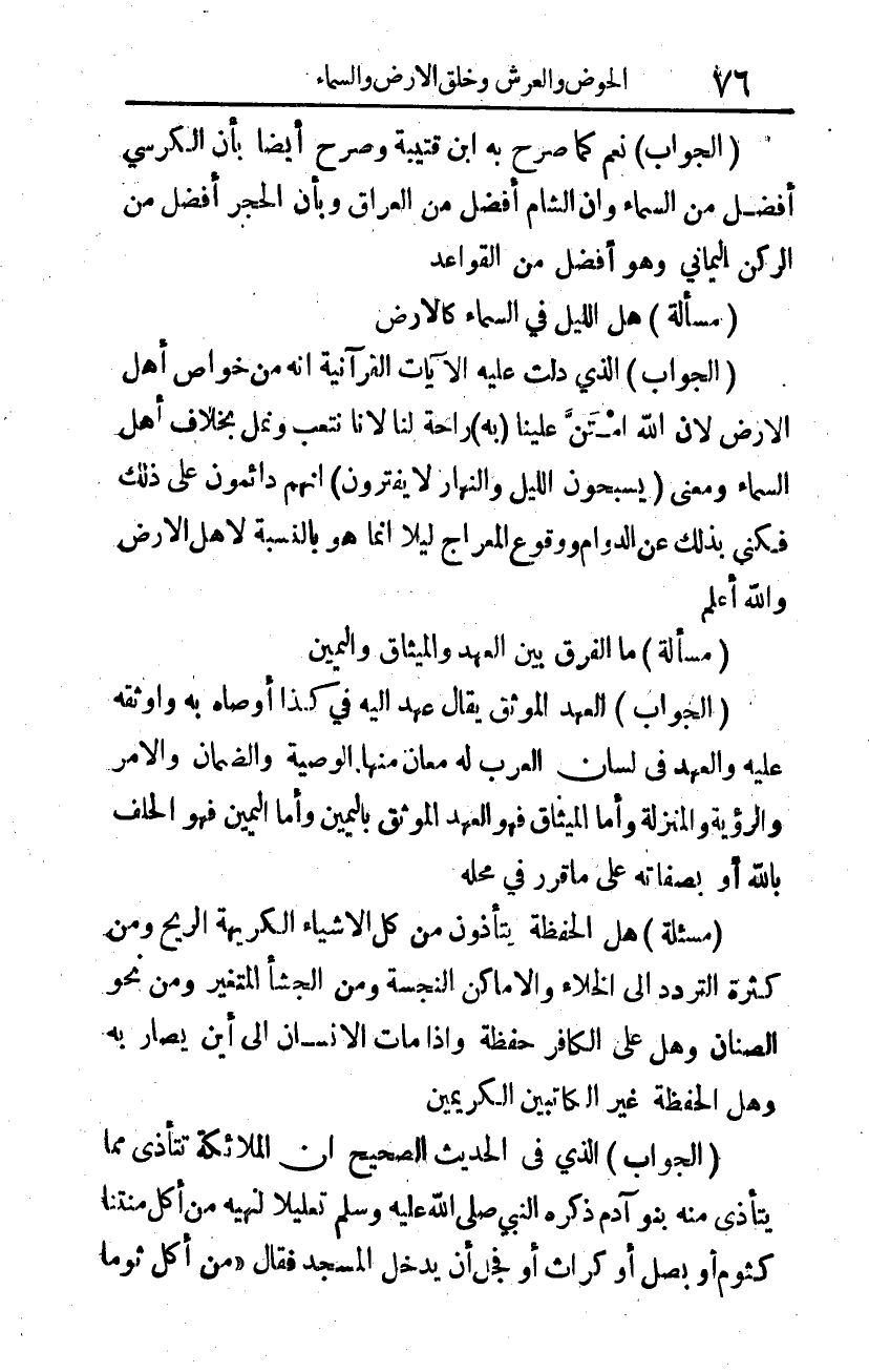 (الجواب): نعم كما صرح به ابن قتيبة، وصرح أيضا بأن الكرسي أفضل من السماء، وأن الشام أفضل من العراق، وبأن الحجر أفضل من الركن اليماني وهو أفضل من القواعد.