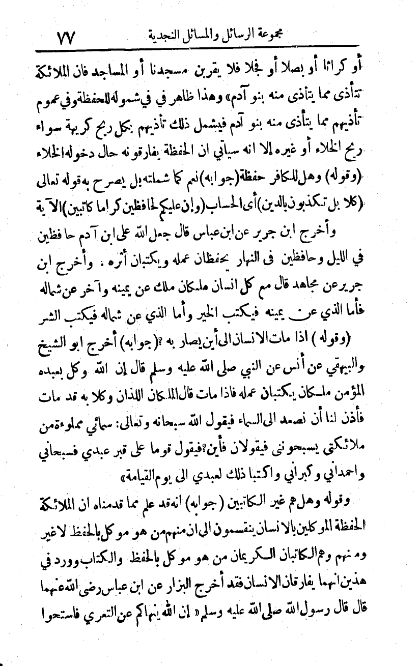 (جوابه): أنه قد علم مما قدمناه: أن الملائكة الحفظة الموكلين بالإنسان ينقسمون إلى: أن منهم من هو موكل بالحفظ لا غير، ومنهم وهم الكاتبان الكريمان من هو موكل بالحفظ والكتاب وورد في هذين أنهما يفارقان الإنسان، فقد أخرج البزار عن ابن عباس- رضي الله عنهما-قال: قال رسول الله -صلى الله عليه وسلم-: "إن الله ينهاكم عن التعري، فاستحوا