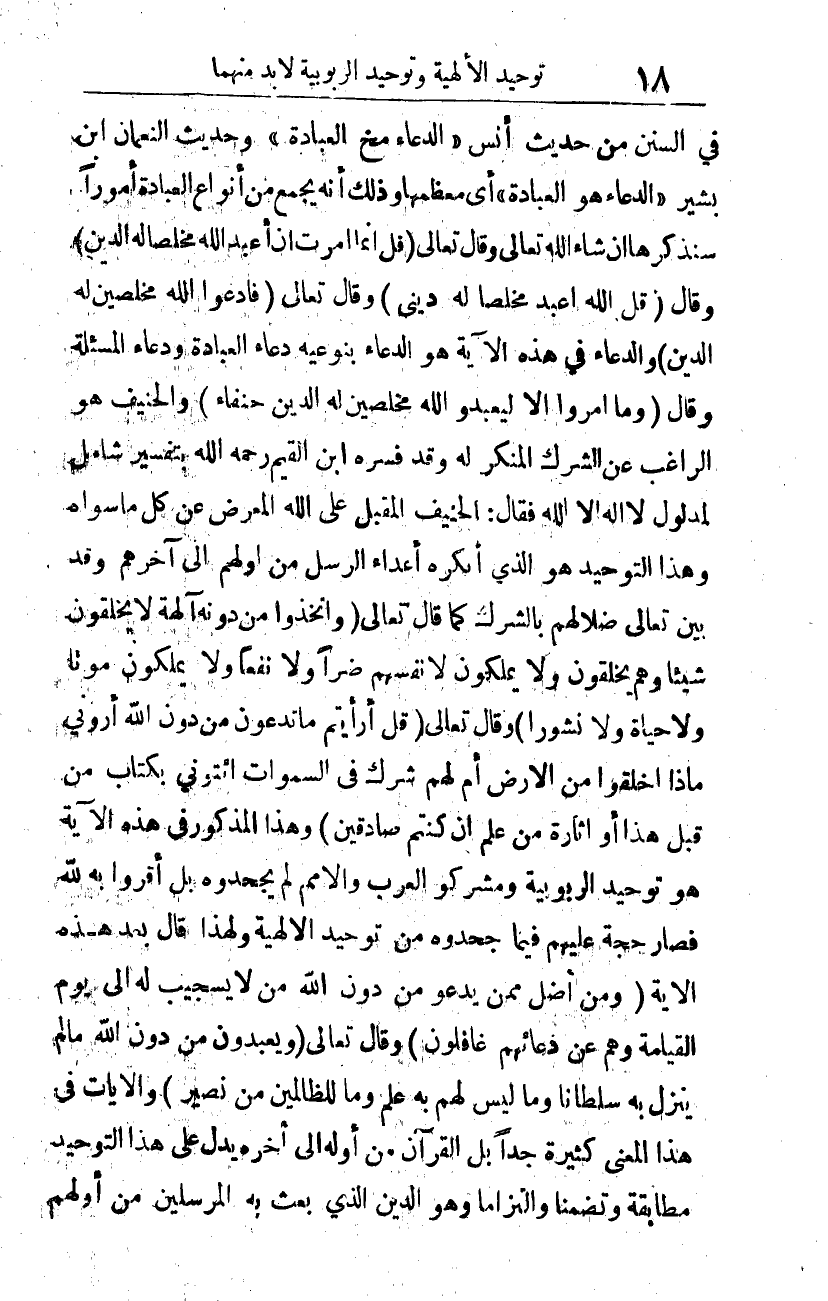 وقال -تعالى-: {قُلْ إِنِّي أُمِرْتُ أَنْ أَعْبُدَ اللَّهَ مُخْلِصًا لَهُ الدِّينَ} 3، وقال -تعالى-: {فَادْعُوا اللَّهَ مُخْلِصِينَ لَهُ الدِّينَ} 4. والدعاء في هذه الآية هو الدعاء بنوعيه: دعاء العبادة، ودعاء المسألة، وقال: {وَمَا أُمِرُوا إِلَّا لِيَعْبُدُوا اللَّهَ مُخْلِصِينَ لَهُ الدِّينَ} 5 والحنيف هو الراغب عن الشرك، المنكر له، وقد فسره ابن القيم -رحمه الله- بتفسير شامل لمدلول لا إله إلا الله فقال: الحنيف المقبل على الله، المعرض عن كل ما سواه، وهذا التوحيد هو الذي أنكره أعداء الرسل من أولهم إلى آخرهم؛ وقد بيّن -تعالى- ضلالهم بالشرك، كما قال -تعالى-: {وَاتَّخَذُوا مِنْ دُونِهِ آلِهَةً لا يَخْلُقُونَ شَيْئًا وَهُمْ يُخْلَقُونَ وَلا يَمْلِكُونَ لِأَنْفُسِهِمْ ضَرًّا وَلا نَفْعًا وَلا يَمْلِكُونَ مَوْتًا وَلا حَيَاةً وَلا نُشُورًا} 6.
