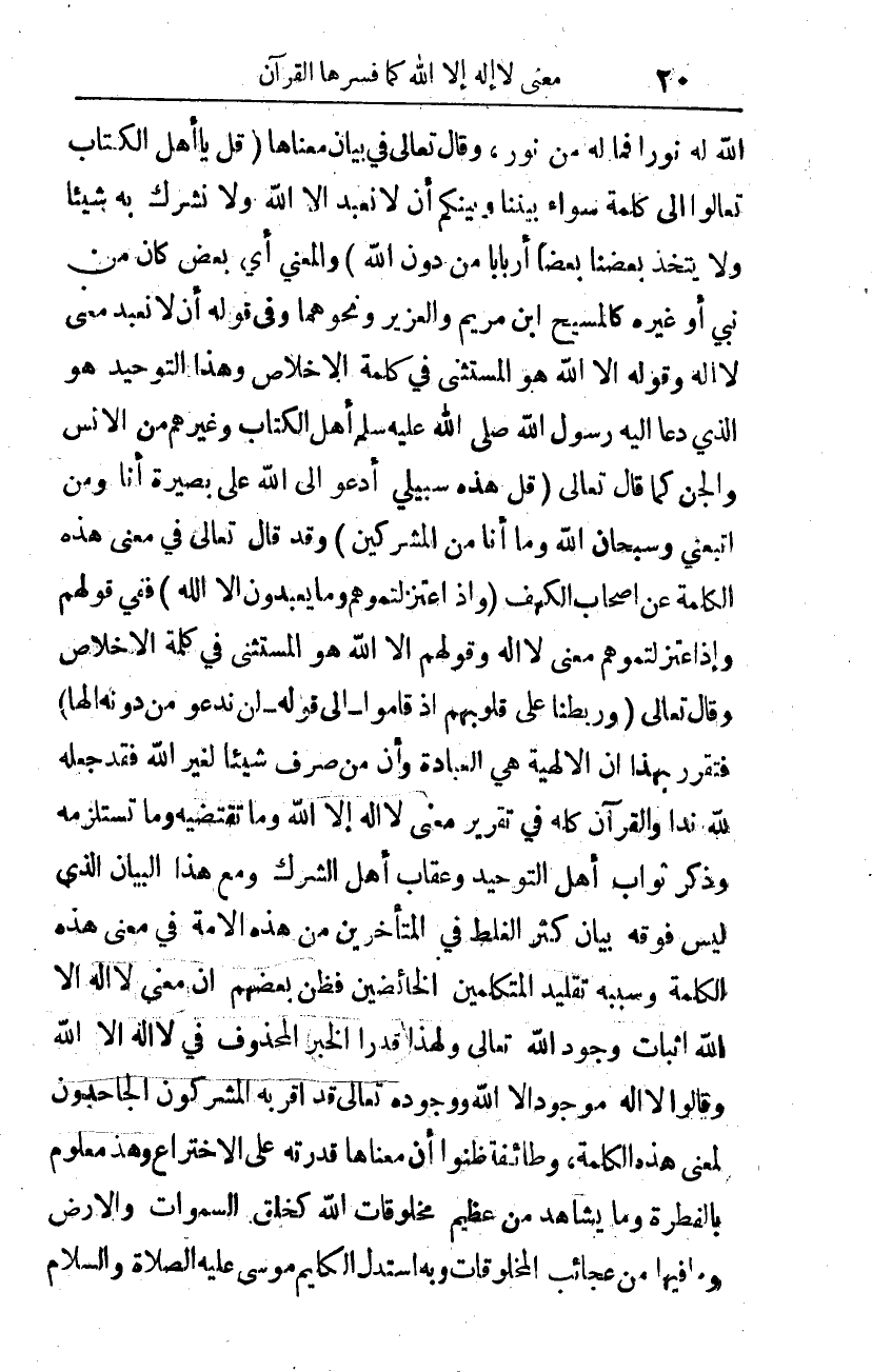 وقال -تعالى- في بيان معناها: {قُلْ يَا أَهْلَ الْكِتَابِ تَعَالَوْا إِلَى كَلِمَةٍ سَوَاءٍ بَيْنَنَا وَبَيْنَكُمْ أَلَّا نَعْبُدَ إِلَّا اللَّهَ وَلا نُشْرِكَ بِهِ شَيْئًا وَلا يَتَّخِذَ بَعْضُنَا بَعْضًا أَرْبَابًا مِنْ دُونِ اللَّهِ} 2 والمعنى: أيّ بعض كان، من نبي أو غيره كالمسيح ابن مريم، والعزير ونحوهما، وفي قوله: {أَلَّا نَعْبُدَ} 3 معنى لا إله وقوله: {إِلَّا اللَّهَ} 4 هو المستثنى في كلمة الإخلاص. وهذا التوحيد هو الذي دعا إليه رسول الله صلى الله عليه وسلم أهل الكتاب وغيرهم من الإنس والجن كما قال -تعالى-: {قُلْ هَذِهِ سَبِيلِي أَدْعُو إِلَى اللَّهِ عَلَى بَصِيرَةٍ أَنَا وَمَنِ اتَّبَعَنِي وَسُبْحَانَ اللَّهِ وَمَا أَنَا مِنَ الْمُشْرِكِينَ} 5، وقد قال -تعالى- في معنى هذه الكلمة عن أصحاب الكهف: {وَإِذِ اعْتَزَلْتُمُوهُمْ وَمَا يَعْبُدُونَ إِلَّا اللَّهَ} 6.