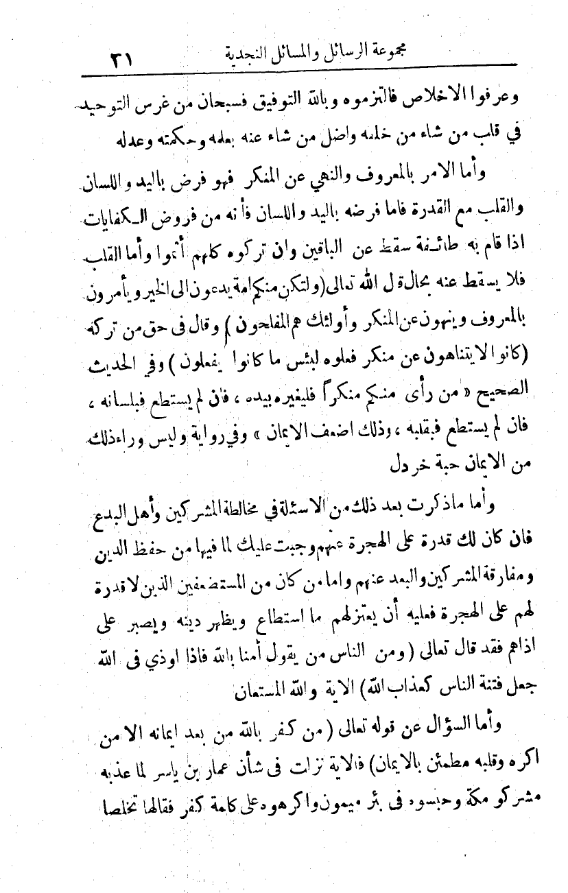 وأما الأمر بالمعروف والنهي عن المنكر فهو فرض باليد واللسان والقلب مع القدرة: فأما فرضه باليد واللسان فإنه من فروض الكفايات؛ إذا قام به طائفة سقط عن الباقين، وإن تركوه كلهم أثموا. وأما القلب فلا يسقط عنه بحال، قال الله -تعالى-: {وَلْتَكُنْ مِنْكُمْ أُمَّةٌ يَدْعُونَ إِلَى الْخَيْرِ وَيَأْمُرُونَ بِالْمَعْرُوفِ وَيَنْهَوْنَ عَنِ الْمُنْكَرِ وَأُولَئِكَ هُمُ الْمُفْلِحُونَ} 1، وقال في حق من تركه: {كَانُوا لا يَتَنَاهَوْنَ عَنْ مُنْكَرٍ فَعَلُوهُ لَبِئْسَ مَا كَانُوا يَفْعَلُونَ} 2. وفي الحديث الصحيح: "من رأى منكم منكرا فليغيره بيده، فإن لم يستطع فبلسانه، فإن لم يستطع فبقلبه، وذلك أضعف الإيمان" 3 وفي رواية: "وليس وراء ذلك من الإيمان حبة خردل" 4.