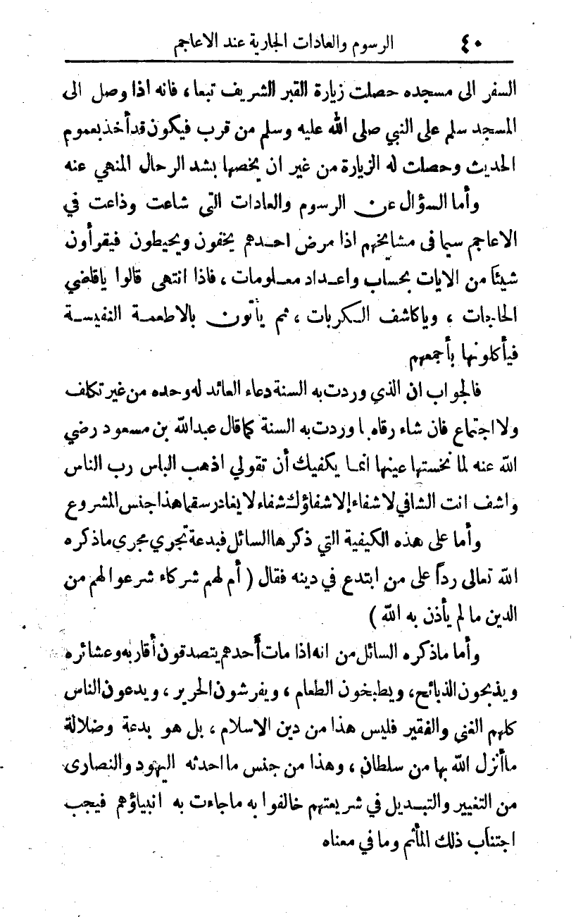 وأما السؤال عن الرسوم والعادات التي شاعت وذاعت في الأعاجم -سيما في مشايخهم- إذا مرض أحدهم يخفون ويحيطون فيقرؤون شيئا من الآيات بحساب وأعداد معلومات، فإذا انتهى قالوا: يا قاضي الحاجات، ويا كاشف الكربات، ثم يأتون بالأطعمة النفيسة فيأكلونها بأجمعهم.