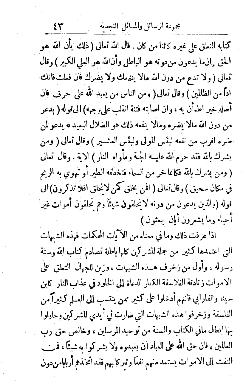 إذا عرفت ذلك وما في معناه من الآيات المحكمات، فهذه الشبهات التي اعتمدها كثير من جملة المشركين كلها باطلة، تصادم كتاب الله وسنة رسوله. وأول من زخرف هذه الشبهات، وزين للجهال التعلق على الأموات: زنادقة الفلاسفة الكفار، الدعاة إلى الخلود في عذاب النار كابن سينا والفارابي؛ فإنهم أدخلوا على كثير ممن ينتسب إلى العلم كثيرا من الفلسفة، وزخرفوا هذه الشبهات التي صارت في أيدي المشركين، وحاولوا بها إبطال ما في الكتاب والسنة من توحيد المرسلين، وخالص حق رب العالمين. فإن حق الله على العباد أن يعبدوه ولا يشركوا به شيئا، فمن التفت إلى الأموات يستمد منهم نفعا وتبركا بهم، فقد اتخذهم أربابا من دون
