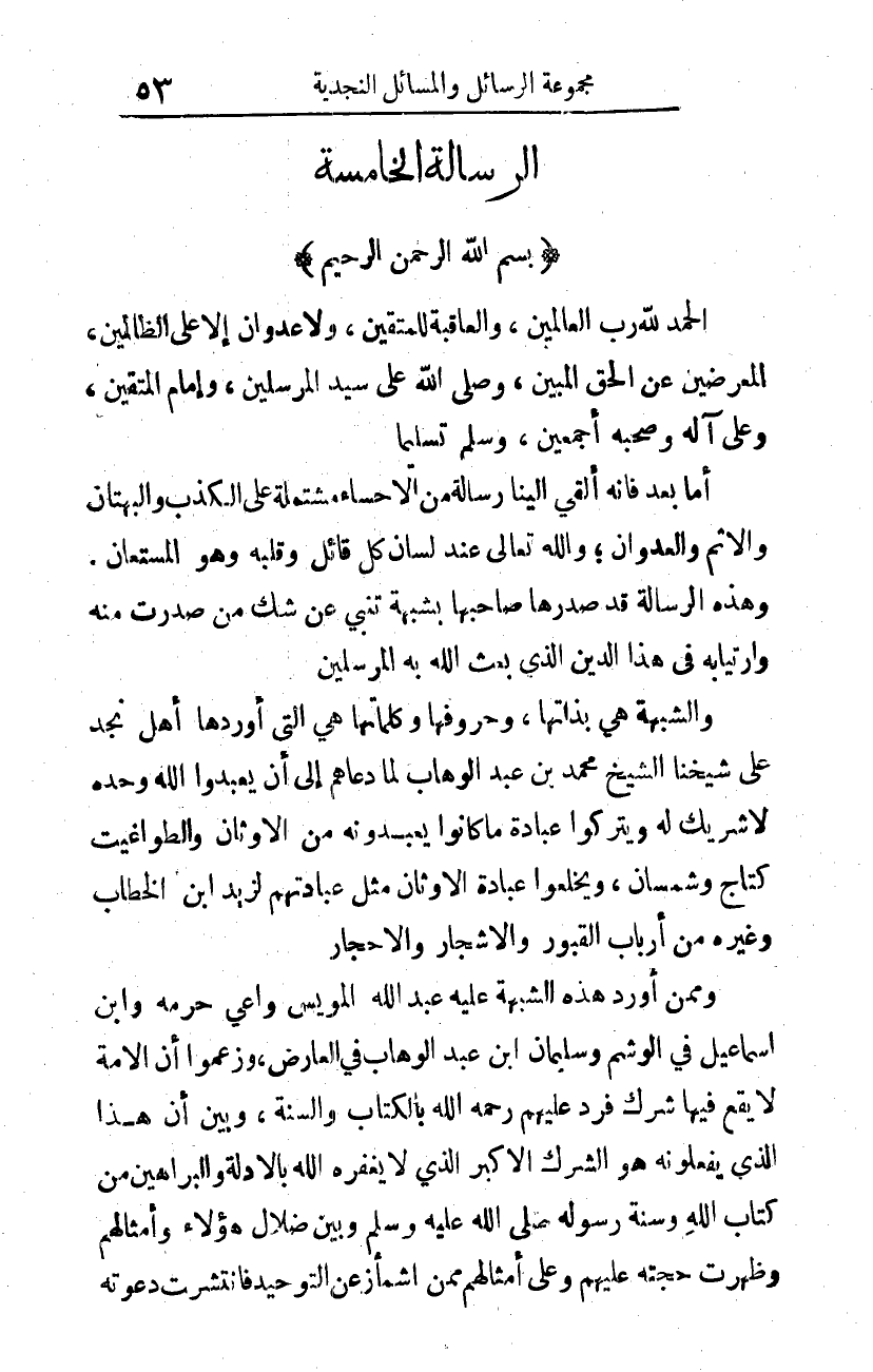 وهذه الرسالة قد صدرها صاحبها بشبهة تنبي عن شك من صدرت منه، وارتيابه في هذا الدين، الذي بعث الله به المرسلين. والشبهة هي بذاتها وحروفها وكلماتها، هي التي أوردها أهل نجد على شيخنا الشيخ محمد بن عبد الوهاب، لما دعاهم إلى أن يعبدوا الله وحده لا شريك له، ويتركوا عبادة ما كانوا يعبدونه من الأوثان والطواغيت كتاج وشمسان، ويخلعوا عبادة الأوثان، مثل عبادتهم لزيد بن الخطاب، وغيره من أرباب القبور، والأشجار، والأحجار.