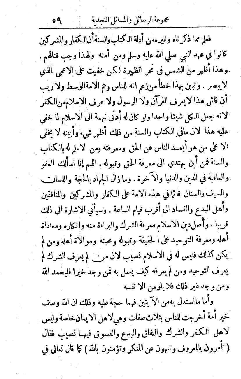 وما زال الجهاد بالحجة واللسان والسيف والسنان قائما في هذه الأمة، على الكفار والمشركين والمنافقين، وأهل البدع والفساد إلى قرب قيام الساعة. وسيأتي الإشارة إلى ذلك قريبا. وأصل دين الإسلام معرفة الشرك، والبراءة منه وإنكاره، ومعاداة أهله، ومعرفة التوحيد على الحقيقة، وقبوله ومحبته، وموالاة أهله، ومن لم يكن كذلك فليس له في الإسلام نصيب؛ لأن من لم يعرف الشرك لم يعرف التوحيد، ومن لم يعرفه كيف يعمل به، فمن وجد خيرا فليحمد الله، ومن وجد غير ذلك فلا يلومن إلا نفسه.