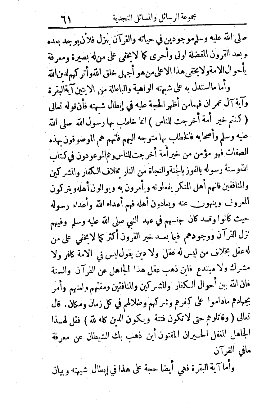 وقد كان جنسهم في عهد النبي صلى الله عليه وسلم وفيهم نزل القرآن، ووجودهم فيما بعد خير القرون أكثر، كما لا يخفى على من له عقل، بخلاف من ليس له عقل ولا دين يقول: ليس في الأمة كافر ولا مشرك ولا مبتدع. فأين ذهب عقل؛ هذا الجاهل عن القرآن والسنة؟! فإن الله بيَّن أحوال الكفار والمشركين والمنافقين، ومقتهم ولعنهم، وأمر بجهادهم ما داموا على كفرهم وشركهم وضلالهم، في كل زمان ومكان. قال تعالى: {وَقَاتِلُوهُمْ حَتَّى لا تَكُونَ فِتْنَةٌ وَيَكُونَ الدِّينُ لِلَّهِ} 2. فقل لهذا الجاهل المغفل الحيران المفتون: أين ذهب بك الشيطان عن معرفة ما في القرآن؟