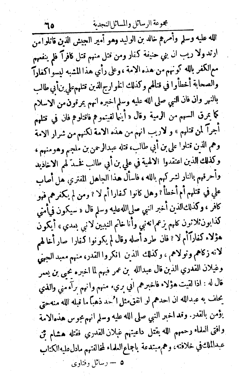 الله عليه وسلم-، وأمرهم خالد بن الوليد وهو أمير الجيش الذين قاتلوا من ارتد، ولا ريب أن بني حنيفة كفار، ومن قتل منهم قتل كافرًا، فلم ينفعهم مع الكفر بالله كونهم من هذه الأمة، وعلى رأي هذا المشبه ليسوا كفارا، والصحابة أخطؤوا في قتالهم.