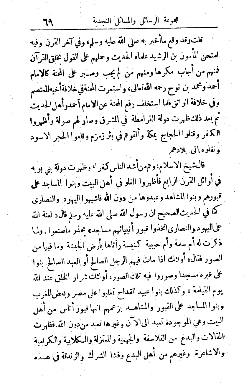 وظهرت دولة بني بويه في أوائل القرن الرابع، فأظهروا الغلو في أهل البيت، وبنوا المساجد على قبورهم، وبنوا المشاهد، وعبدوها من دون الله، فأشبهوا اليهود والنصارى، كما في الحديث الصحيح أن رسول الله صلى الله عليه وسلم قال: "لعنة الله على اليهود والنصارى اتخذوا قبور أنبيائهم مساجد"1 يحذر ما صنعوا.