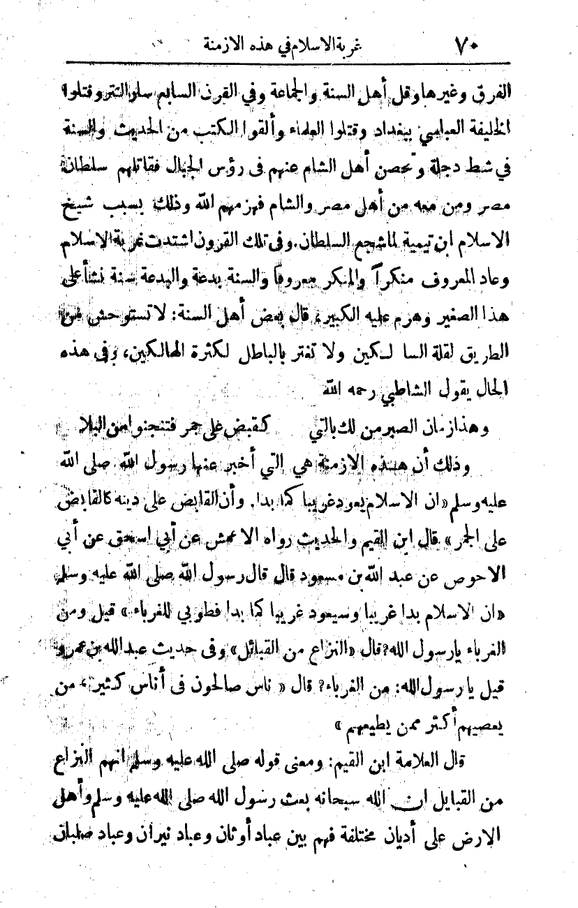 وذلك أن هذه الأزمنة هي التي أخبر عنها رسول الله صلى الله عليه وسلم أن الإسلام يعود غريبا كما بدأ، وأن القابض على دينه كالقابض على الجمر. قال ابن القيم: والحديث رواه الأعمش عن أبي إسحاق عن أبي الأحوص عن عبد الله بن مسعود قال: قال رسول الله صلى الله عليه وسلم: "إن الإسلام بدأ غريبا وسيعود غريبا كما بدأ، فطوبى للغرباء. قيل: ومن الغرباء يا رسول الله؟ قال: النزاع من القبائل"1 وفي حديث عبد الله بن عمرو: "قيل يا رسول الله، من الغرباء؟ قال: ناس صالحون في أناس كثير، من يعصيهم أكثر ممن يطيعهم"2.