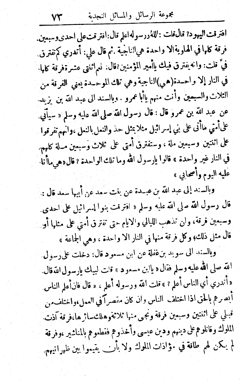 وبالسند إلى عبد الله بن يزيد عن عبد الله بن عمرو قال: قال رسول الله صلى الله عليه وسلم: "سيأتي على أمتي ما أتى على بني إسرائيل مثلا بمثل حذو النعل بالنعل، وإنهم تفرقوا على اثنتين وسبعين ملة، وستفترق أمتي على ثلاث وسبعين ملة، كلهم في النار غير واحدة. قالوا: يا رسول الله، وما تلك الواحدة؟ قال: هي ما أنا عليه اليوم وأصحابي"1.
