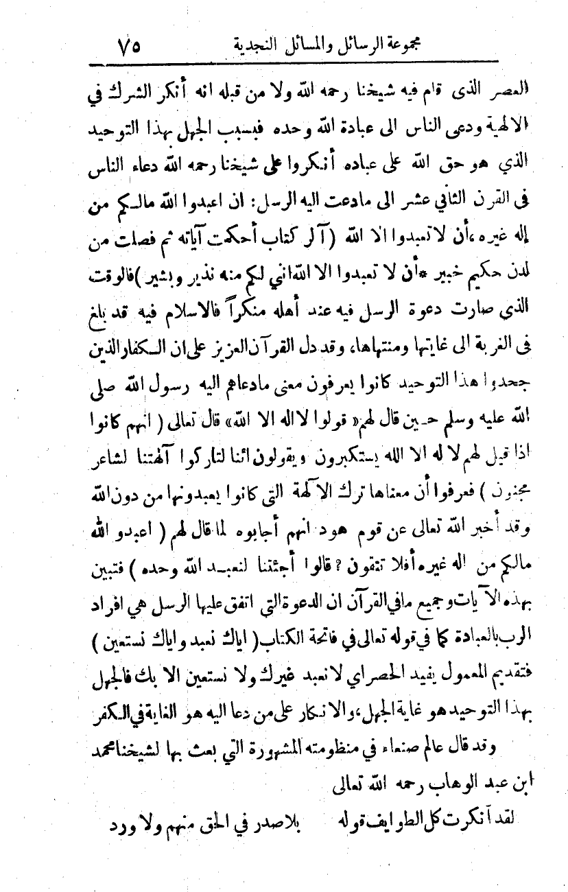 العصر الذي قام فيه شيخنا -رحمه الله- ولا من قبله أنه أنكر الشرك في الإلهية، ودعا الناس إلى عبادة الله وحده؛ فبسبب الجهل بهذا التوحيد الذي هو حق الله على عباده أنكروا على شيخنا -رحمه الله- دعاء الناس في القرن الثاني عشر إلى ما دعت إليه الرسل: {أَنِ اعْبُدُوا اللَّهَ مَا لَكُمْ مِنْ إِلَهٍ غَيْرُهُ}،1 {أَنْ لا تَعْبُدُوا إِلَّا اللَّهَ} 2، {الر كِتَابٌ أُحْكِمَتْ آيَاتُهُ ثُمَّ فُصِّلَتْ مِنْ لَدُنْ حَكِيمٍ خَبِيرٍ} 3.