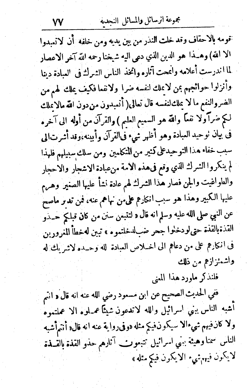 وهذا هو الدين الذي دعا إليه شيخنا -رحمه الله- آخر الأعصار، لما اندرست أعلامه، وانمحت آثاره، واتخذ الناس الشرك في العبادة دينا، وأنزلوا حوائجهم بمن لا يملك لنفسه ضرا ولا نفعا، فكيف يملك لهم من الضر والنفع ما لا يملك لنفسه؟ قال تعالى: {أَتَعْبُدُونَ مِنْ دُونِ اللَّهِ مَا لا يَمْلِكُ لَكُمْ ضَرًّا وَلا نَفْعًا وَاللَّهُ هُوَ السَّمِيعُ الْعَلِيمُ} 2.