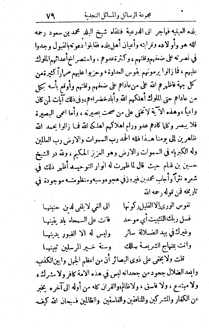 بلده العيَينة*، فهاجر إلى الدرعية. فتلقاه شيخ البلد محمد بن سعود -رحمه الله- هو وأولاده وقرابته وأعيان أهل بلده، فقابلوا دعوته بالقبول، وجدوا في نصرته على ضعفهم وقلتهم، وكثرة عدوهم؛ واستصراخ أعدائهم الملوك عليهم، فما زالوا يرمونهم بقوس العداوة، وحزبوا عليهم مرارًا كثيرة من كل جهة، فأظهرهم الله على من عاداهم -على ضعفهم وقلتهم-، وأوقع بأسه بكل من عاداهم، حتى الملوك أهلكهم الله وأباد خضراءهم، وفي ذلك آيات لمن كان واعيا. وهذه الآية لا تخفى على من صحت بصيرته، وأما أعمى البصيرة فلا يبصر. وكلما كادهم عدو ورام إهلاكهم أهلكه الله، فما زالوا -بحمد الله- ظاهرين إلى يومنا هذا، {فَلِلَّهِ الْحَمْدُ رَبِّ السَّمَاوَاتِ وَرَبِّ الأَرْضِ رَبِّ الْعَالَمِين َوَلَهُ الْكِبْرِيَاءُ فِي السَّمَاوَاتِ وَالأَرْضِ وَهُوَ الْعَزِيزُ الْحَكِيمُ} 1. ولله در الشيخ حسين بن غنام، حيث قال لما ظهرت له أنوار التوحيد، أظهر ذلك في شعره نثرًا، وأجاب محمد بن فيروز في هجوه وسبه، ومنظومته موجودة في تاريخه، فمن قوله -رحمه الله-: