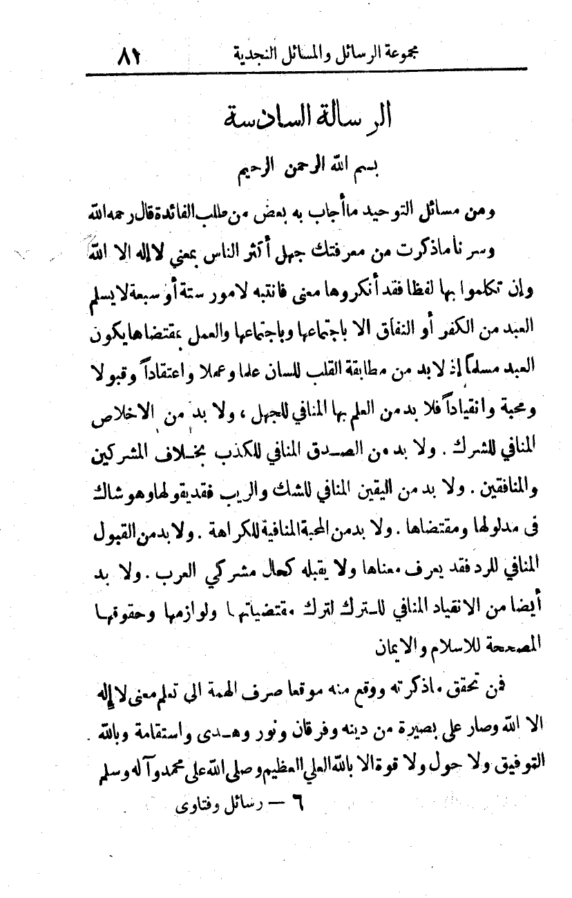 قال -رحمه الله-: وسرنا ما ذكرت من معرفتك جهل أكثر الناس بمعنى (لا إله إلا الله)، وإن تكلموا بها لفظا فقد أنكروها معنى؛ فانتبه لأمور ستة -أو سبعة- لا يسلم العبد من الكفر أو النفاق إلا باجتماعها، وباجتماعها والعمل بمقتضاها يكون العبد مسلمًا؛ إذ لا بد من مطابقة القلب للسان علما وعملا واعتقادًا وقبولا ومحبة وانقيادًا.