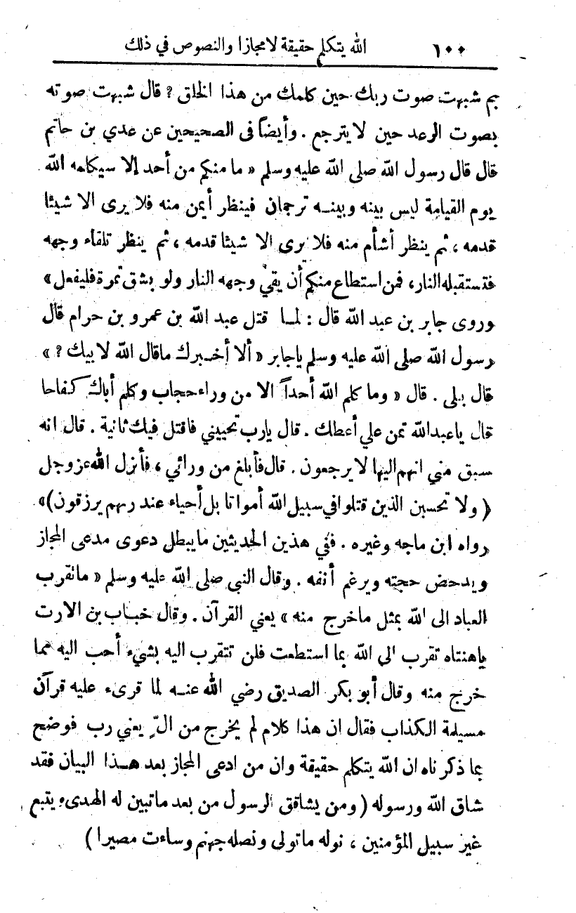 وروى جابر بن عبد الله، قال: لما قتل عبد الله بن عمرو بن حرام قال رسول الله صلى الله عليه وسلم: "يا جابر ألا أخبرك ما قال الله لأبيك؟ قال: بلى. قال: وما كلم الله أحدا إلا من وراء حجاب، وكلم أباك كفاحا قال: يا عبد الله تمنَّ علي أعطك. قال: يا رب تحييني فأقتل فيك ثانية. قال: إنه سبق مني أنهم إليها لا يرجعون. قال: فأبلغ من ورائي، فأنزل الله عز وجل {وَلا تَحْسَبَنَّ الَّذِينَ قُتِلُوا فِي سَبِيلِ اللَّهِ أَمْوَاتًا بَلْ أَحْيَاءٌ عِنْدَ رَبِّهِمْ يُرْزَقُونَ} ".