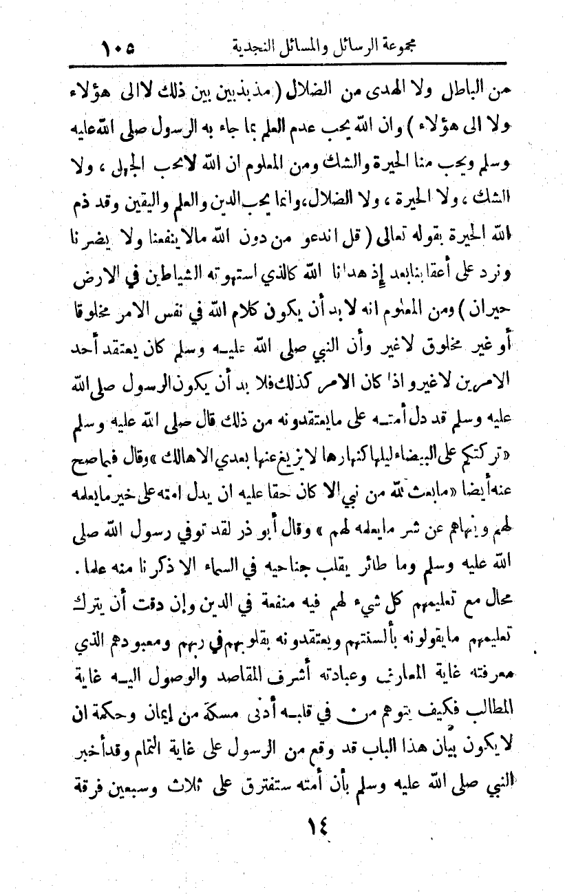 فكيف يتوهم من في قلبه أدنى مسكة من إيمان وحكمة أن لا يكون بيان هذا الباب قد وقع من الرسول على غاية التمام، وقد أخبر النبي صلى الله عليه وسلم بأن أمته ستفترق على ثلاث وسبعين فرقة