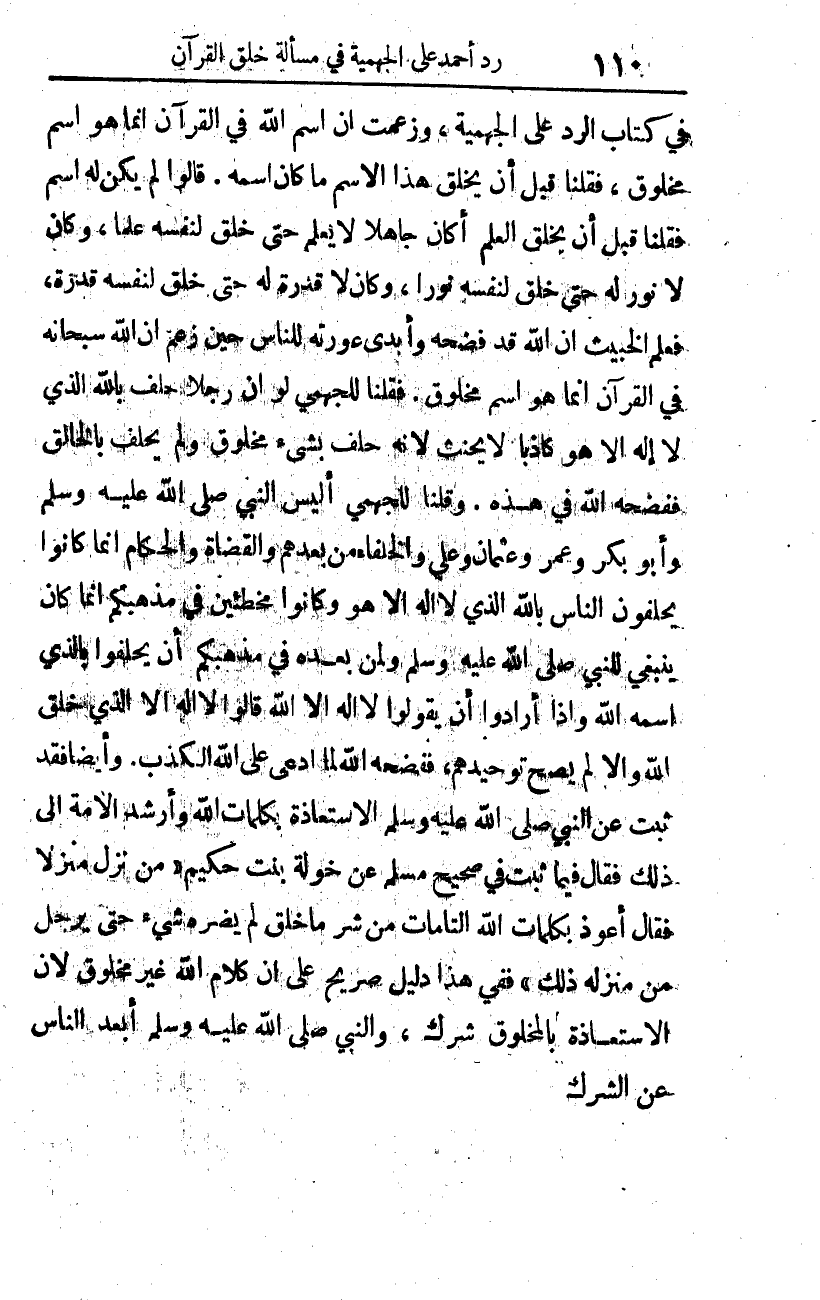 في كتاب "الرد على الجهمية": وزعمتَ أن اسم الله في القرآن إنما هو اسم مخلوق، فقلنا: قبل أن يخلق هذا الاسم ما كان اسمه. قالوا: لم يكن له اسم. فقلنا: قبل أن يخلق العلم، أكان جاهلا لا يعلم حتى خلق لنفسه علما، وكان لا نور له حتى خلق لنفسه نورا، وكان لا قدرة له حتى خلق لنفسه قدرة. فعلم الخبيث أن الله قد فضحه، وأبدى عورته للناس حين زعم أن الله -سبحانه- في القرآن، إنما هو اسم مخلوق.