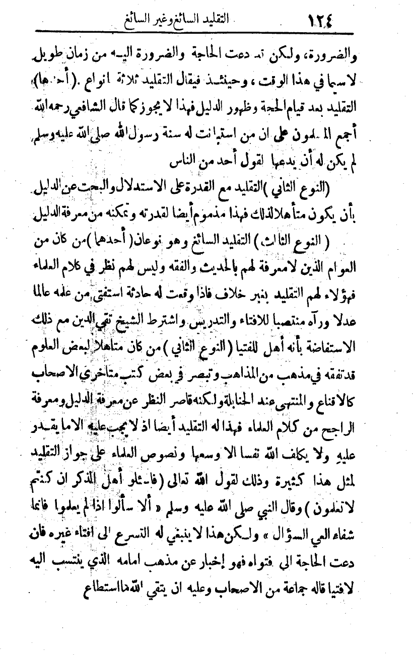 والضرورة، ولكن قد دعت الحاجة والضرورة إليه من زمان طويل لا سيما في هذا الوقت، وحينئذ فيقال: التقليد ثلاثة أنواع: