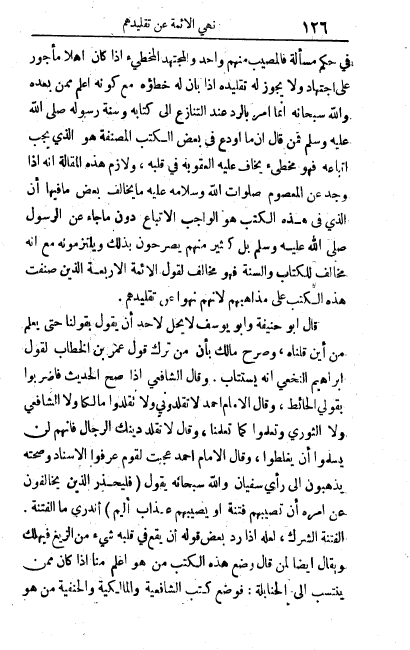 فمن قال: إن ما أودع في بعض الكتب المصنفة هو الذي يجب اتباعه، فهو مخطئ يخاف عليه العقوبة في قلبه، ولازم هذه المقالة أنه إذا وجد عن المعصوم -صلوات الله وسلامه عليه- ما يخالف بعض ما فيها، أن الذي في هذه الكتب هو الواجب الاتباع دون ما جاء عن الرسول -صلى الله عليه وسلم-؛ بل كثير منهم يصرحون بذلك، ويلتزمونه مع أنه مخالف للكتاب والسنة، فهو مخالف لقول الأئمة الأربعة الذين صنفت هذه الكتب على مذاهبهم؛ لأنهم نهوا عن تقليدهم.