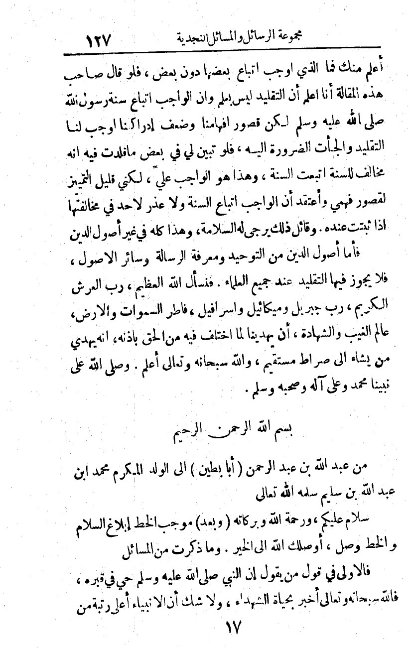 من عبد الله بن عبد الرحمن (أبا بطين) إلى الولد المكرم محمد بن عبد الله بن سليم سلمه الله تعالى. سلام عليكم، ورحمة الله وبركاته