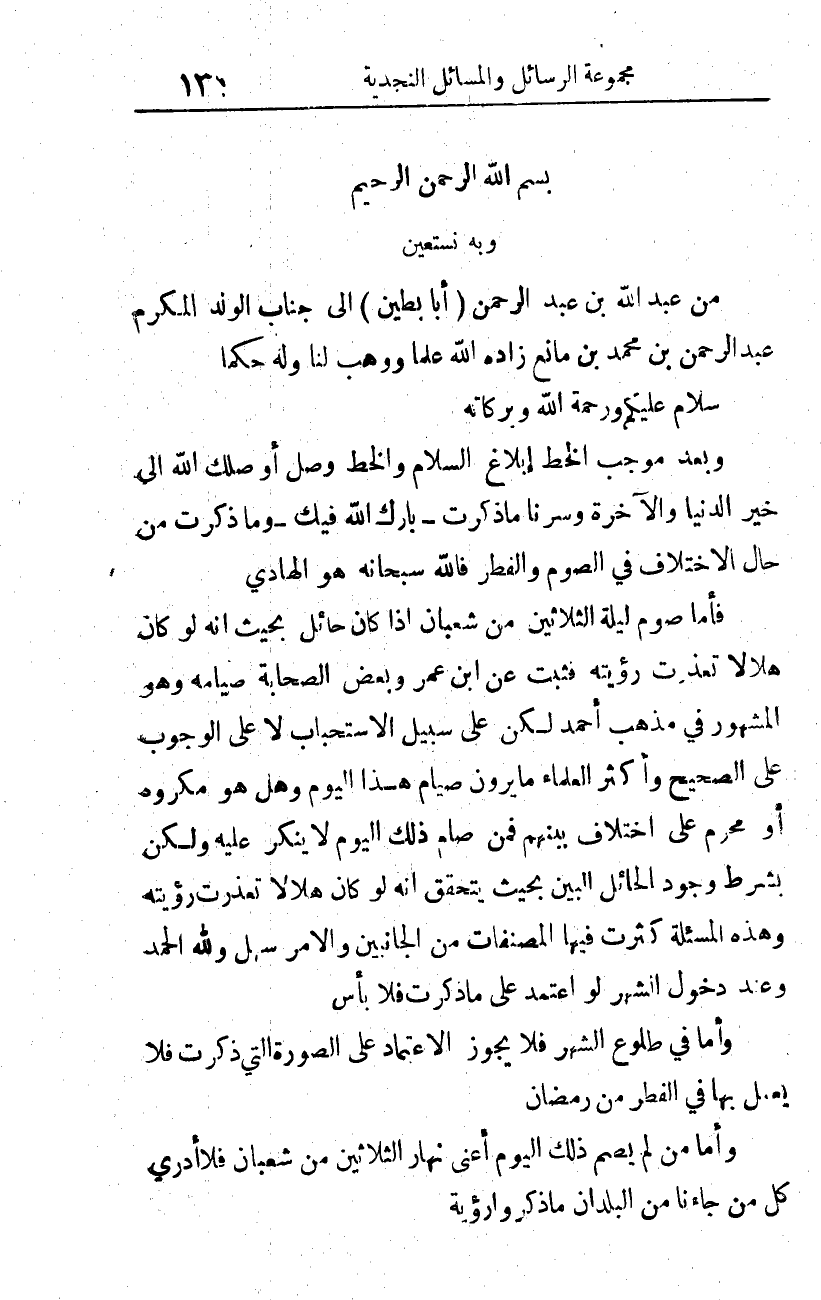 (وبعد): موجب الخط إبلاغ السلام، والخط وصل -أوصلك الله إلى خير الدنيا والآخرة-، وسرنا ما ذكرت -بارك الله فيك-، وما ذكرت من حال الاختلاف في الصوم والفطر، فالله سبحانه هو الهادي.