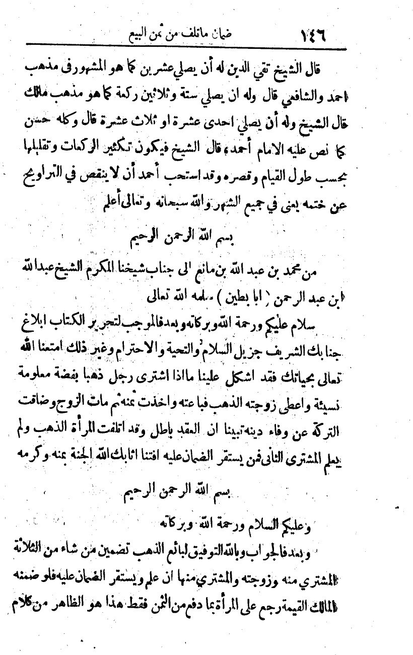 (وبعد): فالموجب لتحرير الكتاب إبلاغ جنابك الشريف جزيل السلام والتحية، والاحترام وغير ذلك -أمتعنا الله تعالى بحياتك- فقد أشكل علينا ما إذا اشترى رجل ذهبا بفضة معلومة نسيئة، وأعطى زوجته الذهب، فباعته وأخذت ثمنه. ثم مات الزوج، وضاقت التركة عن وفاء دينه، تبينا أن العقد باطل، وقد أتلفت المرأة الذهب، ولم يُعلم المشتري الثاني، فمن يستقر الضمان عليه؟ أفتنا أثابك الله الجنة بمنه وكرمه.