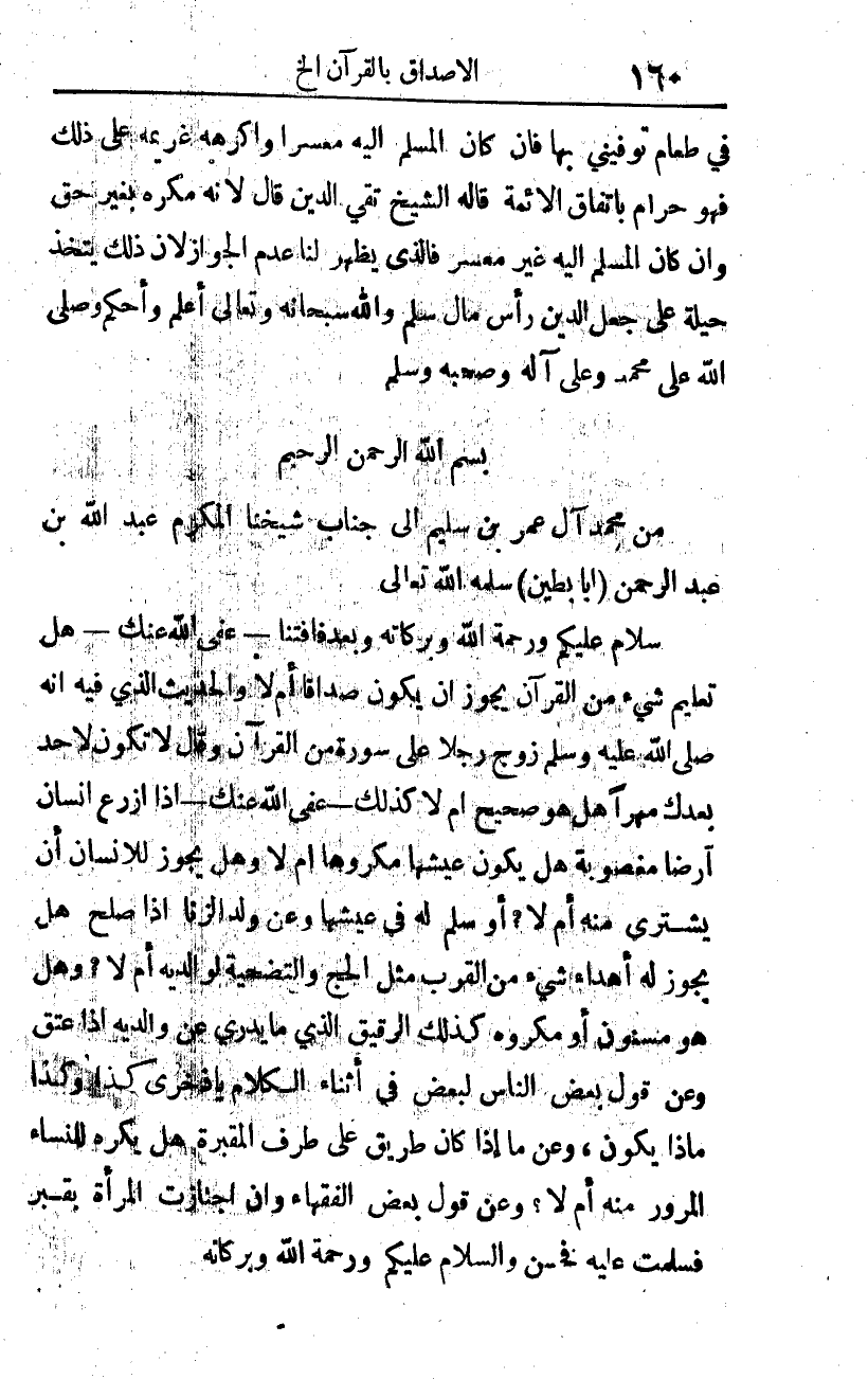 من محمد آل عمر بن سليم إلى جناب شيخنا المكرم عبد الله بن عبد الرحمن (أبا بطين) سلمه الله تعالى.