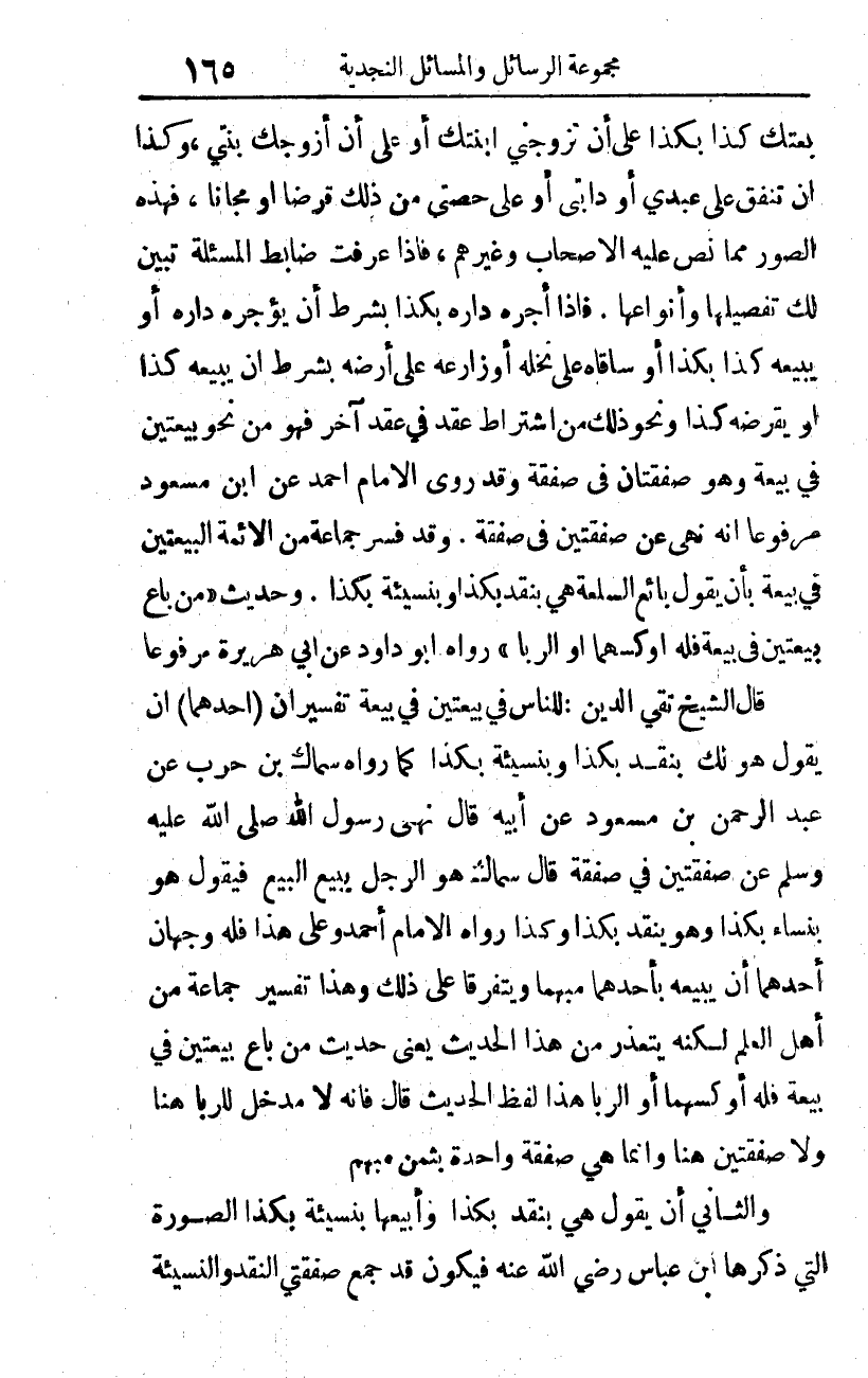 قال الشيخ تقي الدين: للناس في بيعتين في بيعة تفسيران: (أحدهما) أن يقول: هو لك بنقد بكذا، وبنسيئة بكذا، كما رواه سماك بن حرب عن عبد الرحمن بن مسعود عن أبيه قال: "نهى رسول الله صلى الله عليه وسلم عن صفقتين في صفقة"2، قال سماك: "هو الرجل يبيع البيع، فيقول: هو بنساء بكذا، وهو ينقد بكذا وكذا" رواه الإمام أحمد. وعلى هذا فله وجهان:
