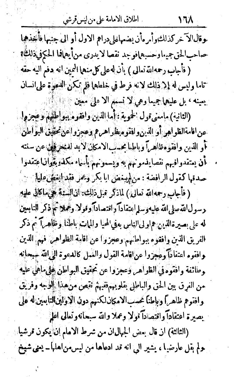 (الثالثة): إن قال بعض الجهال: إن من شرط الإمام أن يكون قرشيا، ولم يقل عارضيا، يشير إلى أنه قد ادعاها من ليس من أهلها، يعني شيخ