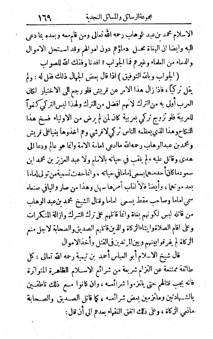 (الجواب) وبالله التوفيق: إذا قال بعض الجهال ذلك فقل له: ولم يقل تركيًا، فإذا زال هذا الأمر عن قريش، فلو رجع إلى الاختيار لكان العرب أولى به من الترك؛ لأنهم أفضل من الترك؛ ولهذا ليس التركي كفوا للعربية، فلو تزوج تركي بعربية كان لمن لم يرض من الأولياء فسخ هذا النكاح، وهذا الذي يعظمه الناس تركي لا قرشي، وهم أخذوها بغيا على قريش. ومحمد بن عبد الوهاب -رحمه الله- ما ادعى إمامة الأمة، وإنما هو عالم، ودعا إلى هدى، وقاتل عليه، ولم يلقب في حياته بالإمام، ولا عبد العزيز بن محمد بن سعود، ما كان أحد منهما يسمى إماما في حياته، وإنما حدث تسمية من تولى إماما بعد موتهما.