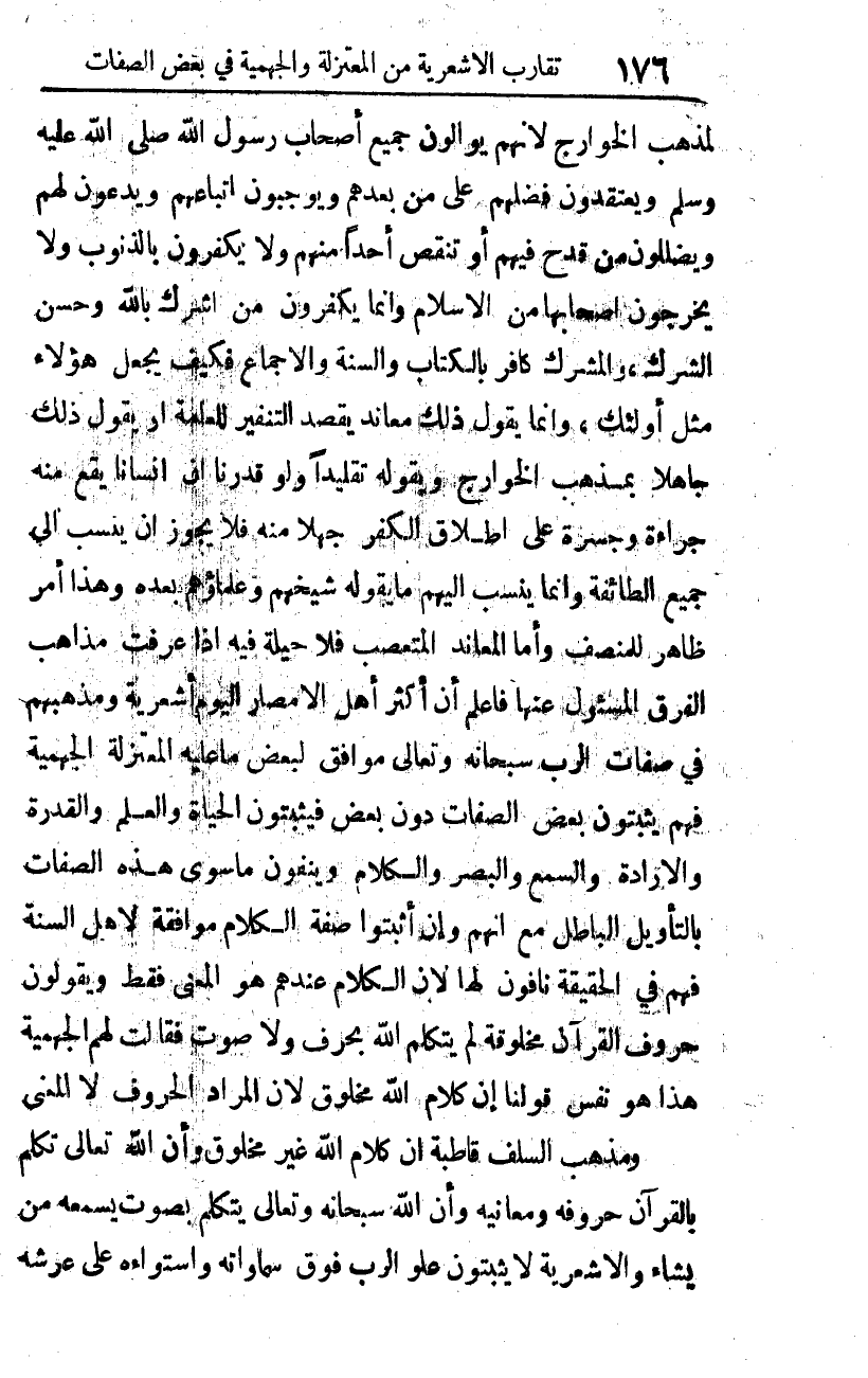 ولو قدرنا أن إنسانا يقع منه جراءة وجسرة على إطلاق الكفر جهلا منه، فلا يجوز أن ينسب إلى جميع الطائفة، وإنما ينسب إليهم ما يقوله شيخهم وعلماؤهم بعده؛ وهذا أمر ظاهر للمنصف، وأما المعاند المتعصب فلا حيلة فيه. إذا عرفت مذاهب الفرق المسؤول عنها، فاعلم أن أكثر أهل الأمصار اليوم أشعرية، ومذهبهم في صفات الرب -سبحانه وتعالى- موافق لبعض ما عليه المعتزلة الجهمية؛ فهم يثبتون بعض الصفات دون بعض. فيثبتون الحياة والعلم والقدرة والإرادة والسمع والبصر والكلام، وينفون ما سوى هذه الصفات بالتأويل الباطل، مع أنهم وإن أثبتوا صفة الكلام موافقة لأهل السنة فهم في الحقيقة نافون لها لأن الكلام عندهم هو المعنى فقط، ويقولون: حروف القرآن مخلوقة؛ لم يتكلم الله بحرف ولا صوت. فقالت لهم الجهمية: هذا هو نفس قولنا: إن كلام الله مخلوق لأن المراد الحروف لا المعنى.