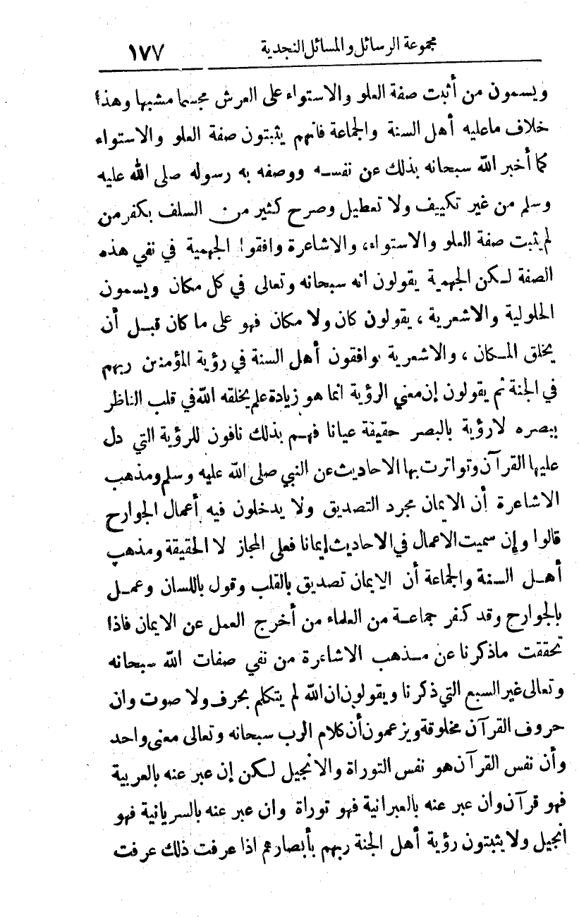 ومذهب أهل السنة والجماعة: أن الإيمان تصديق بالقلب، وقول باللسان، وعمل بالجوارح. وقد كفر جماعة من العلماء من أخرج العمل عن الإيمان. فإذا تحققت ما ذكرنا عن مذهب الأشاعرة من نفي صفات الله -سبحانه وتعالى- غير السبع التي ذكرنا، ويقولون: إن الله لم يتكلم بحرف، ولا صوت، وأن حروف القرآن مخلوقة، ويزعمون أن كلام الرب -سبحانه وتعالى- معنى واحد، وأن نفس القرآن هو نفس التوراة والإنجيل، لكن إن عبر عنه بالعربية فهو قرآن، وإن عبر عنه بالعبرانية فهو توراة، وإن عبر عنه بالسريانية فهو إنجيل، ولا يثبتون رؤية أهل الجنة ربهم بأبصارهم، إذا عرفت ذلك عرفت