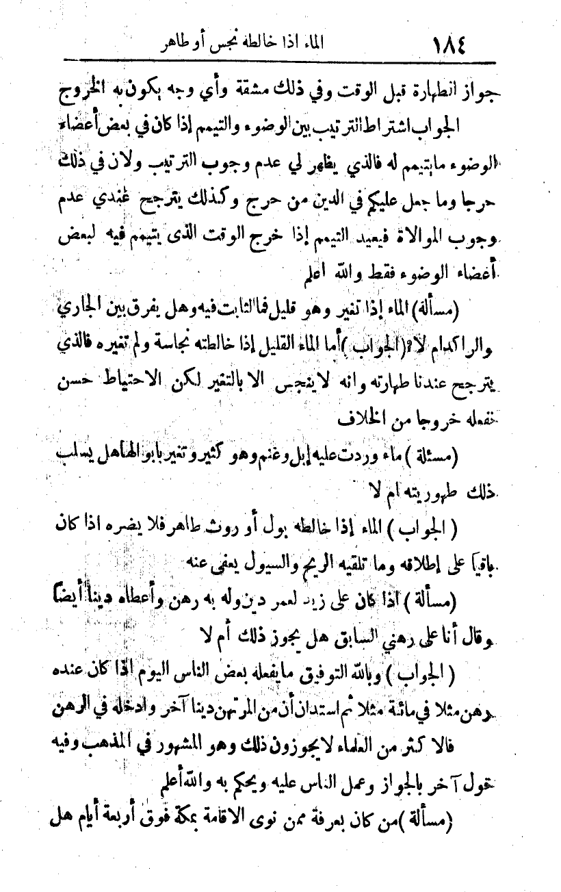 (الجواب): الماء إذا خالطه بول، أو روث طاهر فلا يضره، إذا كان باقيا على إطلاقه. وما تلقيه الريح، والسيول يعفى عنه.