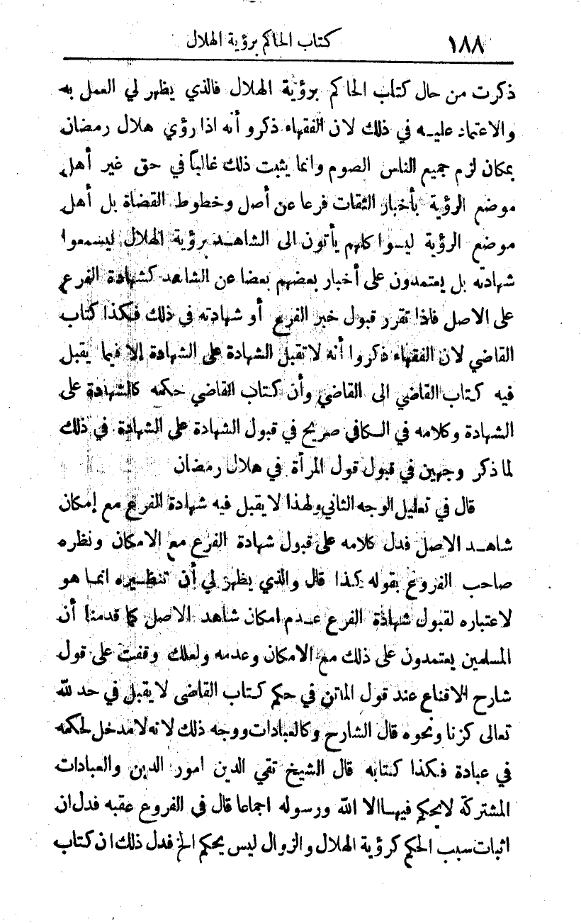 ذكرت من حال كتاب الحاكم برؤية الهلال، فالذي يظهر لي العمل به، والاعتماد عليه في ذلك، لأن الفقهاء ذكروا أنه إذا رُئِىَ هلال رمضان بمكان لزم جميع الناس الصوم؛ وإنما يثبت ذلك غالبا في حق غير أهل موضع الرؤية بأخبار الثقات فرعا عن أصل، وخطوط القضاة، بل أهل موضع الرؤية، ليسوا كلهم يأتون إلى الشاهد برؤية الهلال ليسمعوا شهادته، بل يعتمدون على أخبار بعضهم بعضا عن الشاهد، كشهادة الفرع على الأصل. فإذا تقرر قبول خبر الفرع، أو شهادته في ذلك، فكذا كتاب القاضي؛ لأن الفقهاء ذكروا أنه لا تقبل الشهادة على الشهادة إلا فيما يقبل فيه كتاب القاضي إلى القاضي، وأن كتاب القاضي حكمه كالشهادة على الشهادة. وكلامه في الكافي صريح في قبول الشهادة على الشهادة في ذلك، لما ذكر وجهين في قبول قول المرأة في هلال رمضان.